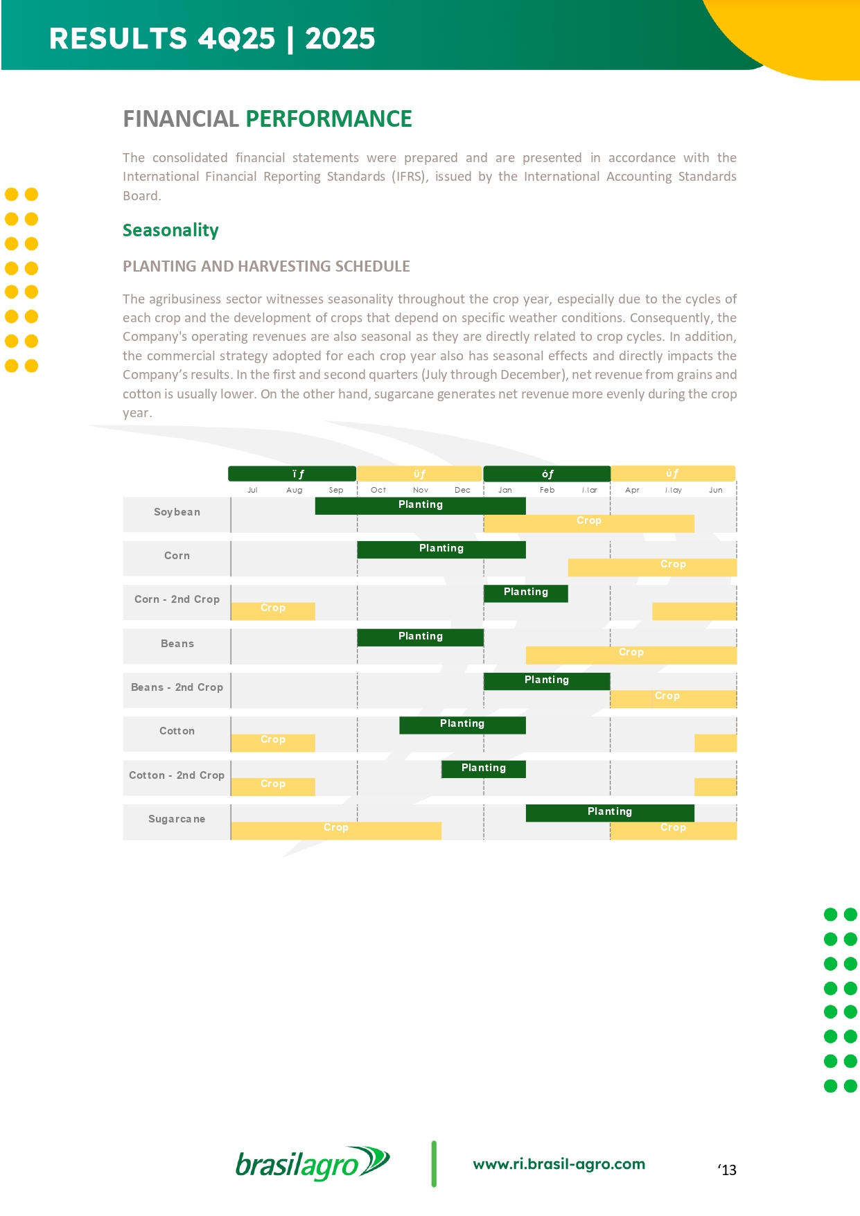 财务表现合并财务报表是根据国际会计准则理事会颁布的国际财务报告准则(IFRS)编制和列报的。季节性种植和收获时间表农业综合企业部门在整个作物年度见证季节性,特别是由于每种作物的周期和作物的发展取决于特定的天气条件。因此,该公司的营业收入也具有季节性,因为它们与作物周期直接相关。此外,每个作物年度采取的商业策略也具有季节性影响,直接影响公司的业绩。在第一和第二季度(7月至12月),来自谷物和棉花的净收入通常较低。另一方面,甘蔗在作物年度产生的净收入更加平均。7月8月2月3月4月5月6月作物种植甘蔗作物作物作物作物棉花-第二季作物种植作物豆子-第二季作物种植棉花种植豆子种植作物玉米-第二季作物种植作物大豆种植作物玉米种植作物ï f ü ff sep Oct Nov Dec Jan'13 ó f ú f