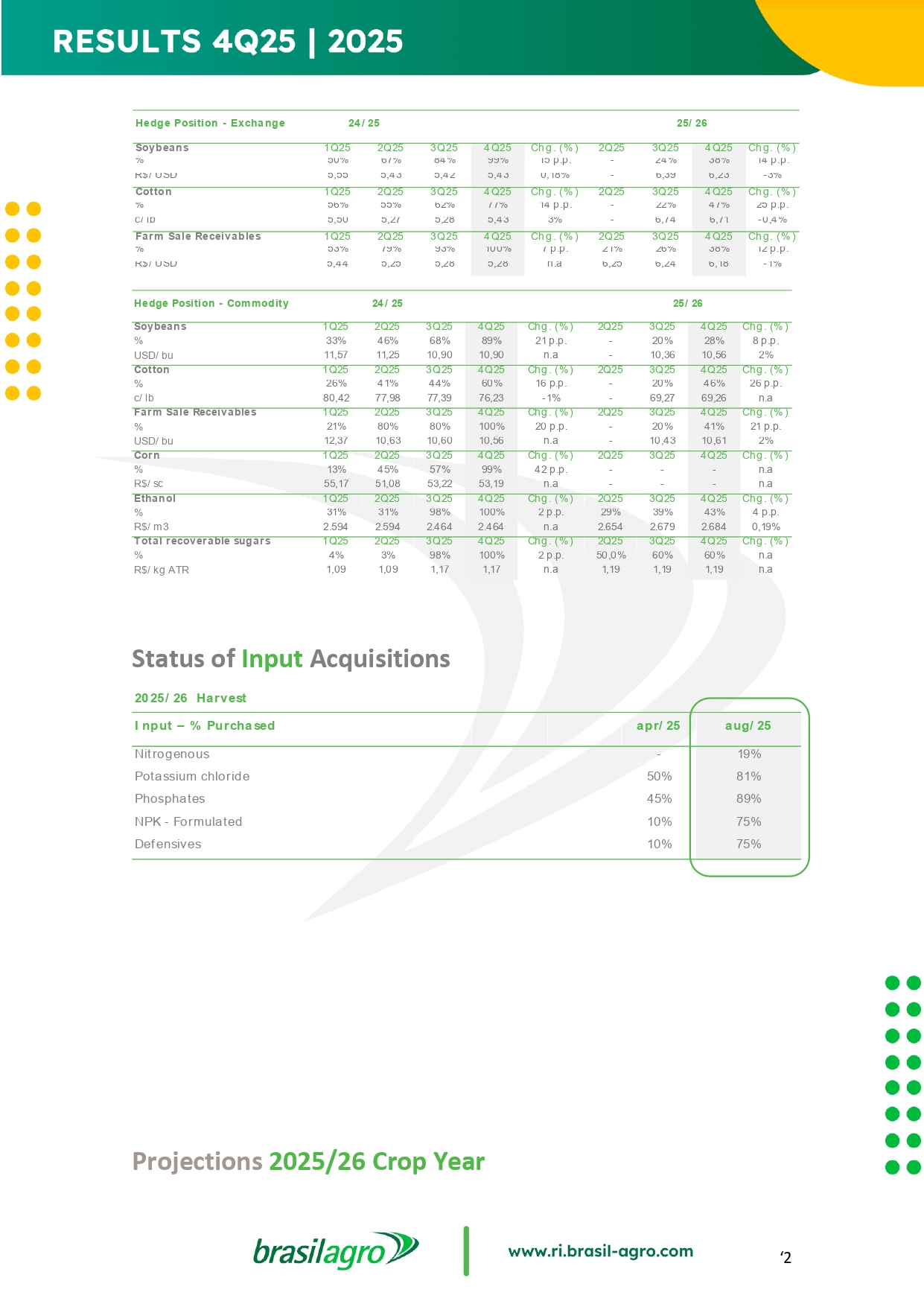 预测2025/26作物年度25/26对冲头寸-交易所24/25CHG。(%)4 Q25 3Q25 2Q25 CHG。(%)4 Q25 3Q25 2Q25 1Q25大豆14 p.p. 38% 99% 24%-15 p.p. 84% 67% 50%%-3% 6,236,39-0,18% 5,435,425,435,55 R $/USD CHG。(%)4 Q25 3Q25 2Q25 CHG。(%)4 Q25 3Q25 2Q25 1Q25棉花25 p.p. 47% 77% 22%-14 p.p. 62% 55% 56%%-0,4% 6,716,74-3% 5,435,285,275,50 c/lb CHG。(%)4 Q25 3Q25 2Q25 CHG。(%)4 Q25 3Q25 2Q25 1Q25农场销售应收账款12 p.p. 38% 26% 100% 7 p.p. 21% 93% 79% 53%%-1% 6,186,24 n.a 6,255,285,285,255,44 R $/USD 25/26对冲头寸-商品24/25 CHG。(%)4 Q25 3Q25 2Q25 CHG。(%)4 Q25 3Q25 2Q25 1Q25大豆8 p.p. 28% 20%-21 p.p. 89% 68% 46% 33%% 2% 10,5610,36-n.a 10,9010,9011,2511,57美元/蒲式干酪。(%)4 Q25 3Q25 2Q25 CHG。(%)4 Q25 3Q25 2Q25 1Q25棉花26 p.p. 46% 20%-16 p.p. 60% 44% 41% 26%% n.a 69,2669,27--1% 76,2377,3977,9880,42 c/lb CHG。(%)4 Q25 3Q25 2Q25 CHG。(%)4 Q25 3Q25 2Q25 1Q25农场销售应收账款21 p.p. 41% 20%-20 p.p. 100% 80% 80% 21%% 2% 10,6110,43-n.a 10,5610,6010,6312,37美元/bu CHG。(%)4 Q25 3Q25 2Q25 CHG。(%)4 Q25 3Q25 2Q25 1Q25玉米n.a---42 p.p. 99% 57% 45% 13%% n.a---n.a 53,1953,2251,0855,17 R $/SC CHG。(%)4 Q25 3Q25 2Q25 CHG。(%)4 Q25 3Q25 2Q25 1Q25乙醇4 p.p. 43% 39% 29% 2 p.p. 100% 98% 31% 31% 31% % 0,19% 2.6842.6792.654 n.a 2.4642.4642.5942.594 R $/m 3 CHG。(%)4 Q25 3Q25 2Q25 CHG。(%)4 Q25 3Q25 2Q25 1Q25总可回收糖n.a 60% 60% 50,0% 2 p.p. 100% 98% 3% 4%% n.a 1,191,191,19 n.a 1,171,171,091,09 R $/kg ATR投入收购情况2025/26 Harvest aug/25 apr/25 i nput –%购买19%-含氮81% 50%氯化钾89% 45%磷酸盐75% 10% NPK-配方75% 10% def ensiv es‘2