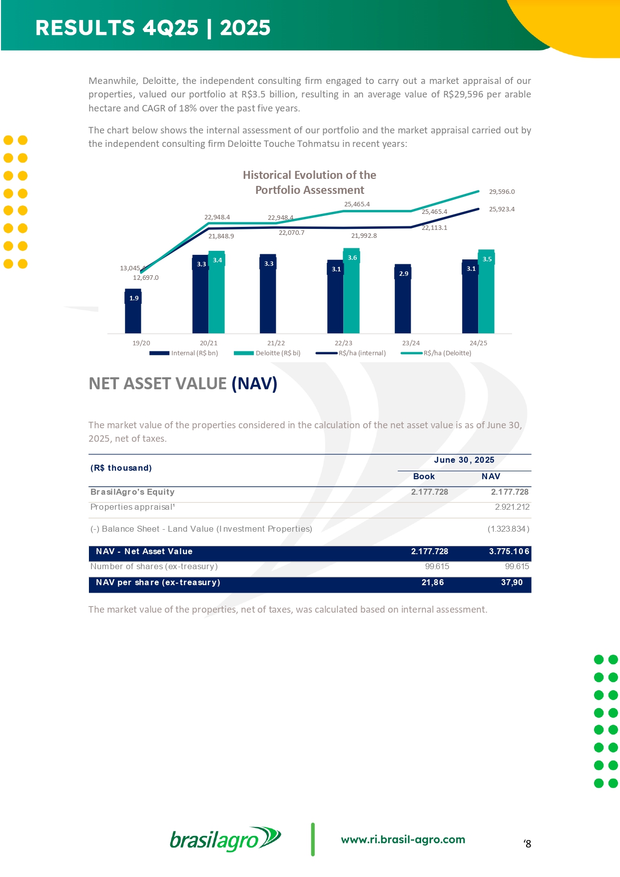与此同时,聘请对我们的物业进行市场评估的独立咨询公司德勤对我们的投资组合估值为3雷亚尔。50亿,平均价值29雷亚尔,每耕地596,过去五年CAGR 18%。下图显示了我们投资组合的内部评估以及独立咨询公司德勤华永近年来进行的市场评估:净资产价值(NAV)在计算净资产价值时考虑的物业的市场价值截至2025年6月30日,税后净额。物业的市场价值,扣除税项,是根据内部评估计算的。1.9 3.3 3.3 3.1 2.9 3.1 3.4 3.6 3.522,070.721,848.921,992.825,923.413,045.412,697.02 2,948.425,465.422,113.12 9,596.019/2023/24投资组合评估的历史演变25,465.422,948.420/21内部(十亿雷亚尔)21/22德勤(R $ bi)22/23 R $/ha(internal)24/25 R $/ha(Deloitte)‘8 June 30,2025(R $千)NAV book 2.17 7.72 82.17 7.728 BrasilAgro’Equity 2.92 1.212 Properties assessment丨(1.32 3.834)(-)资产负债表-土地价值(i novestment properties)3.775.10 62.17 7.7
