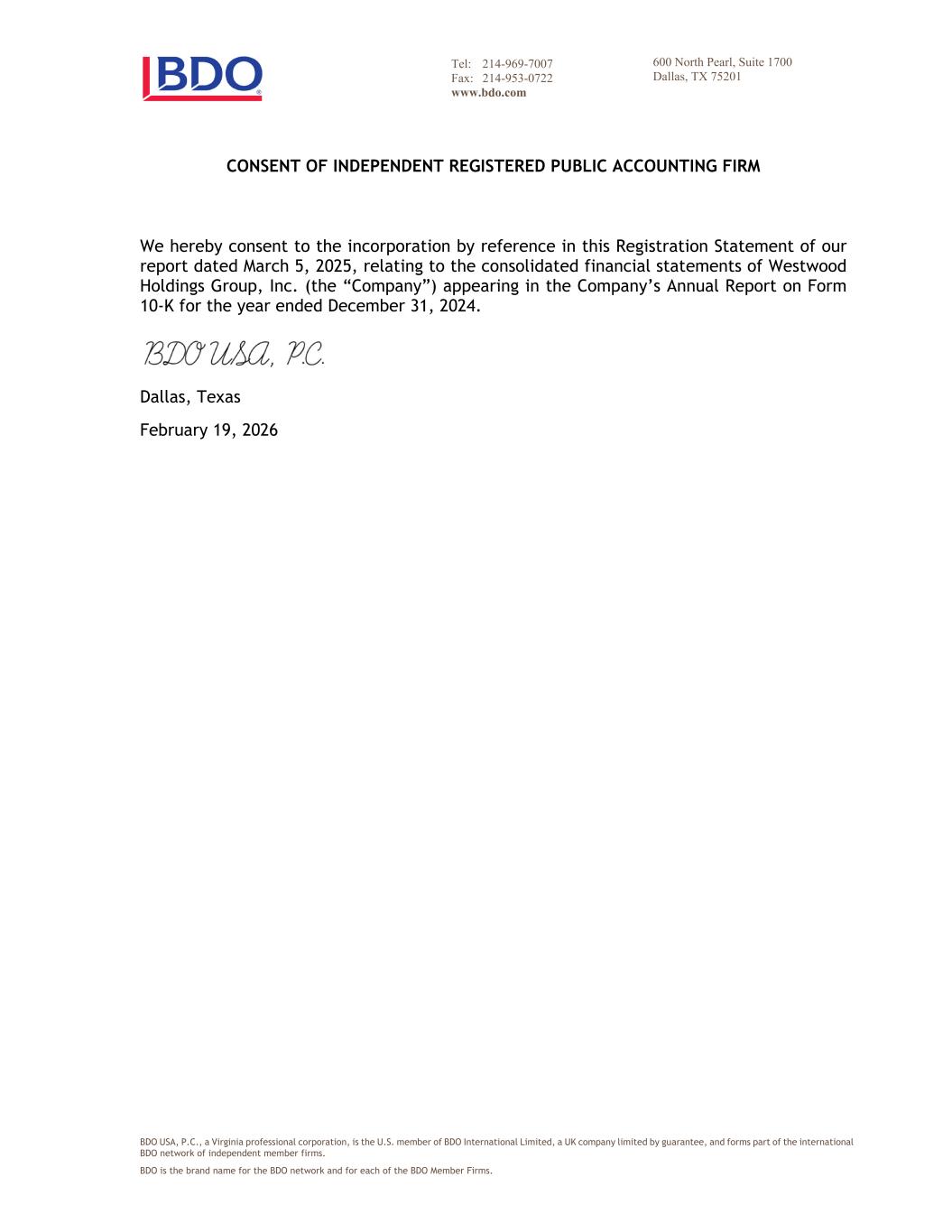 BDO USA,P.C.是一家弗吉尼亚州的专业公司,是英国担保有限公司BDO International Limited的美国成员,是独立成员公司国际BDO网络的一部分。BDO是BDO网络和每个BDO成员公司的品牌名称。电话:214-969-7007传真:214-953-0722 www.bdo.com 600 North Pearl,Suite 1700 Dallas,TX75201同意独立注册会计师事务所我们特此同意在本注册声明中以引用方式纳入我们日期为2025年3月5日的报告,内容涉及公司截至2024年12月31日止年度的10-K表格年度报告中出现的Westwood Holdings Group, Inc.(“公司”)的综合财务报表。德克萨斯州达拉斯2026年2月19日