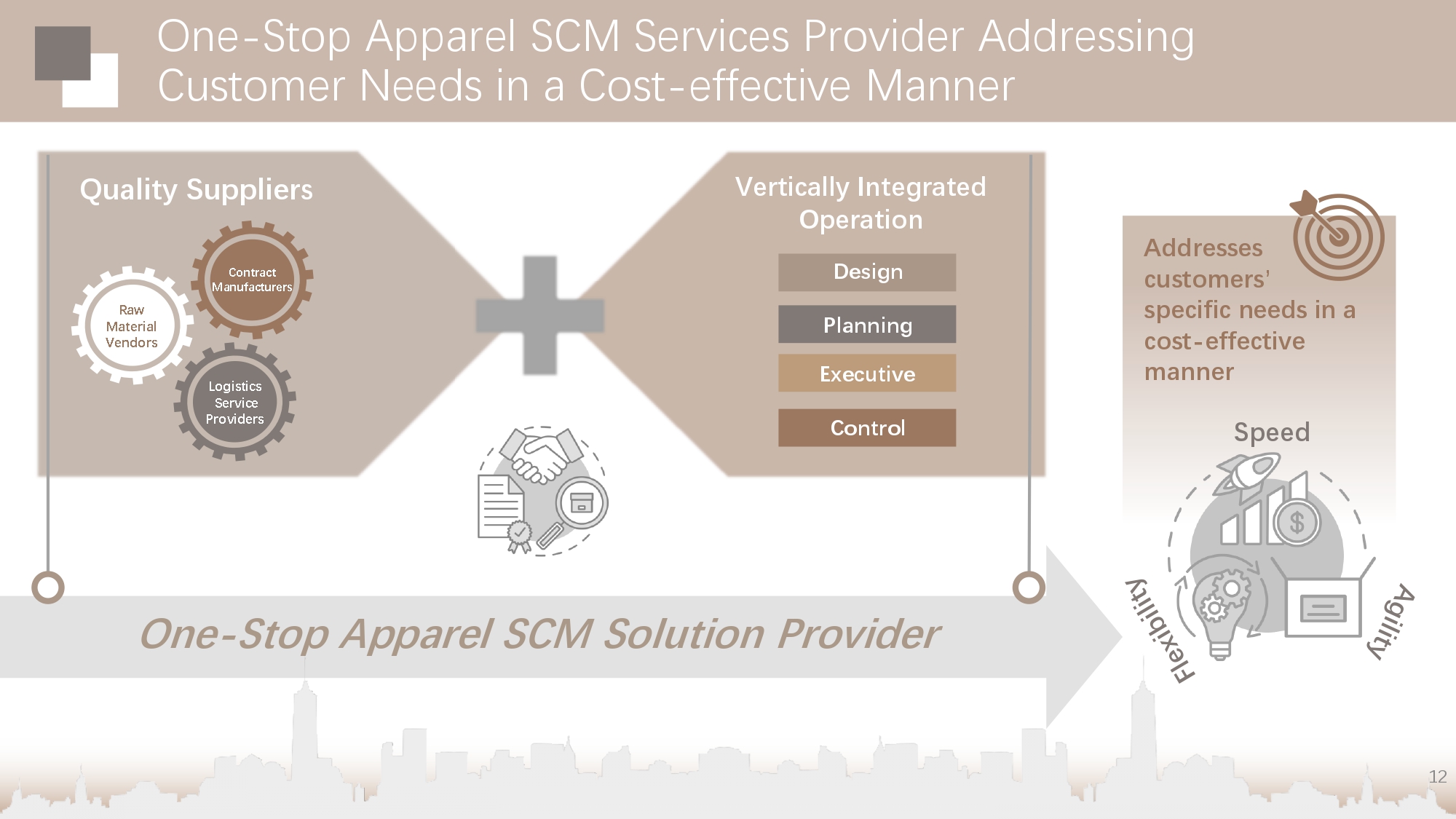 一站式服装SCM服务提供商以具有成本效益的方式满足客户需求一站式服装SCM解决方案提供商质量供应商原材料供应商合同制造商物流服务提供商垂直一体化运营设计规划执行控制以具有成本效益的方式满足客户的特定需求速度12