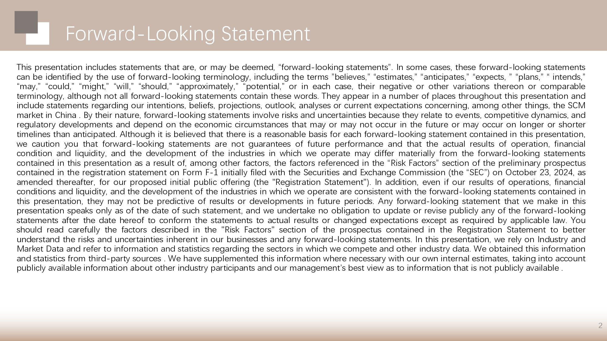 前瞻性陈述2本演示文稿包含属于或可能被视为“前瞻性陈述”的陈述。在某些情况下,可以通过使用前瞻性术语来识别这些前瞻性陈述,包括“相信”、“估计”、“预期”、“预期”、“计划”、“打算”、“可能”、“可能”、“可能”、“将”、“应该”、“大约”、“潜在”,或者在每种情况下,它们的负面或其他变体或类似术语,尽管并非所有前瞻性陈述都包含这些词语。它们出现在整个演示文稿的多个地方,包括关于我们的意图、信念、预测、前景、分析或当前预期的陈述,其中涉及中国的SCM市场。就其性质而言,前瞻性陈述涉及风险和不确定性,因为它们与事件、竞争动态和监管发展相关,并取决于未来可能发生或可能不会发生的经济情况,或可能发生在比预期更长或更短的时间内。尽管我们认为本演示文稿中包含的每项前瞻性陈述都有合理的依据,但我们提醒您,前瞻性陈述并非对未来业绩的保证,并且实际经营结果、财务状况和流动性以及我们经营所在行业的发展可能与本演示文稿中包含的前瞻性陈述存在重大差异,原因之一是,于2024年10月23日首次向美国证券交易委员会(“SEC”)提交的F-1表格注册声明中包含的初步招股说明书“风险因素”部分中提及的因素,该声明随后经修订,用于我们提议的首次公开募股(“注册声明”)。此外,即使我们的经营业绩、财务状况和流动性以及我们经营所在行业的发展与本演示文稿中包含的前瞻性陈述一致,它们也可能无法预测未来期间的结果或发展。我们在本演示文稿中所做的任何前瞻性陈述仅在此类陈述发布之日发表,我们不承担在本演示文稿发布之日之后公开更新或修改任何前瞻性陈述以使这些陈述符合实际结果或改变的预期的义务,除非适用法律要求。您应该仔细阅读注册声明中包含的招股说明书“风险因素”部分中描述的因素,以更好地了解我们的业务和任何前瞻性陈述中固有的风险和不确定性。在本演示文稿中,我们依赖行业和市场数据,并参考有关我们竞争的行业的信息和统计数据以及其他行业数据。我们从第三方来源获得了这些信息和统计数据。我们在必要时用我们自己的内部估计补充了这些信息,同时考虑到了关于其他行业参与者的公开信息以及我们管理层对未公开信息的最佳看法。