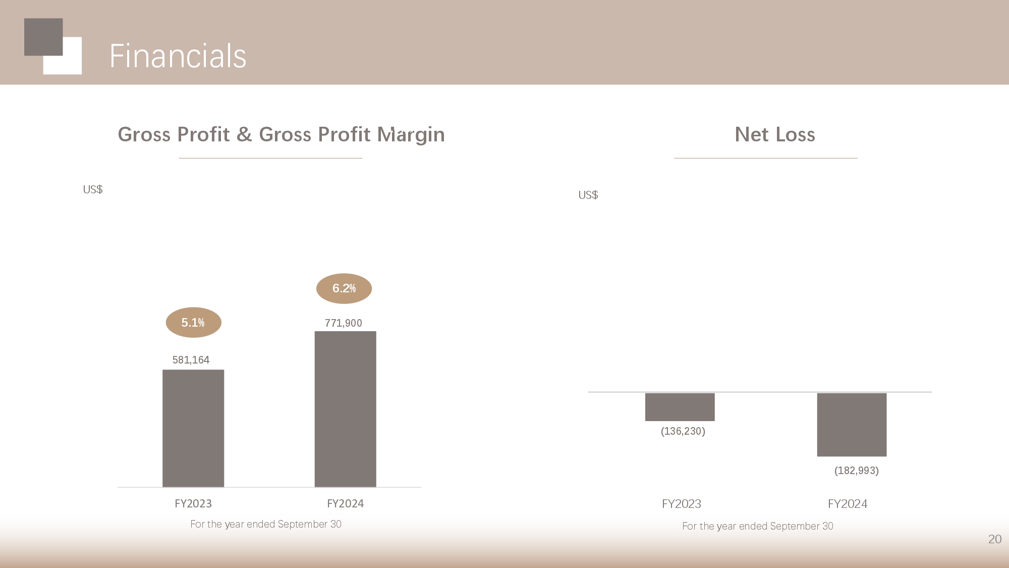 (136,230)581,164771,900 FY2023FY2024截至9月30日止年度净亏损美元毛利及毛利M16 a。3 r % g in US $ 5.1%(182,993)FY2023 FY2024截至9月30日止年度财务6.2% 20