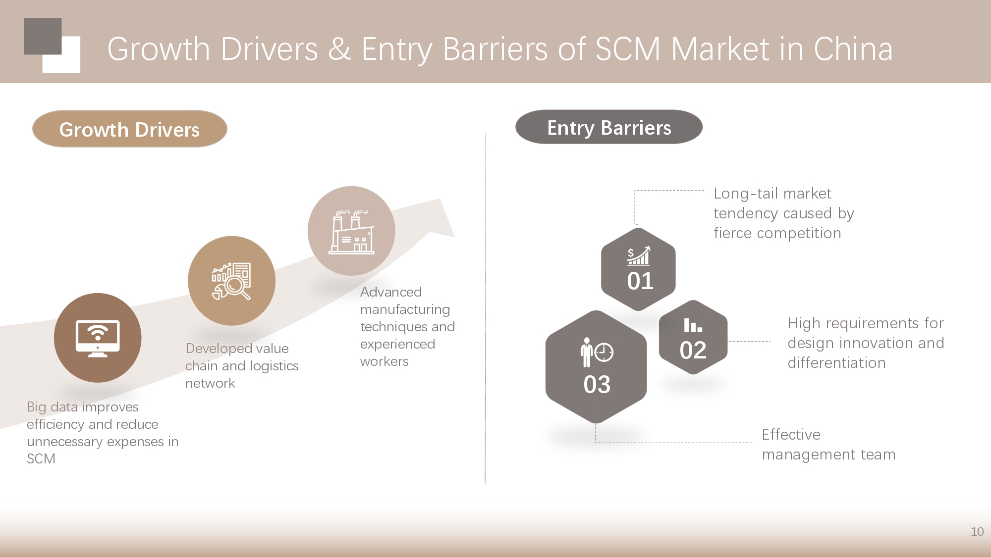 高效管理团队设计创新差异化要求高010203竞争激烈导致的长尾市场倾向大数据提升效率,减少供应链中不必要的开支发达的价值链和物流网络先进的制造工艺和经验丰富的工人成长驱动因素进入壁垒中国供应链管理市场的10个增长驱动因素&进入壁垒