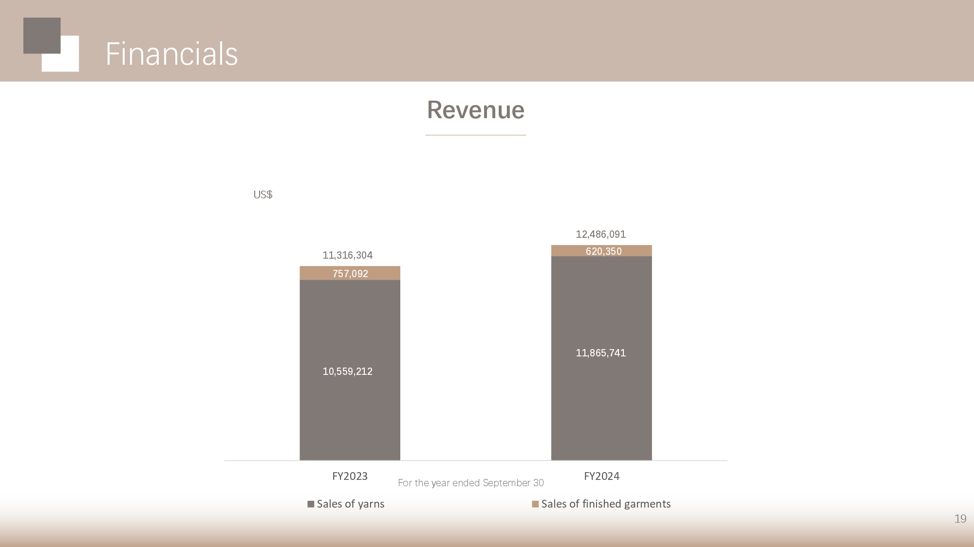 截至9月30日止年度的收入财务2023财年2024财年销售纱线销售成品成衣19757,092美元10,559,21211,316,30411,865,741620,35012,486,091