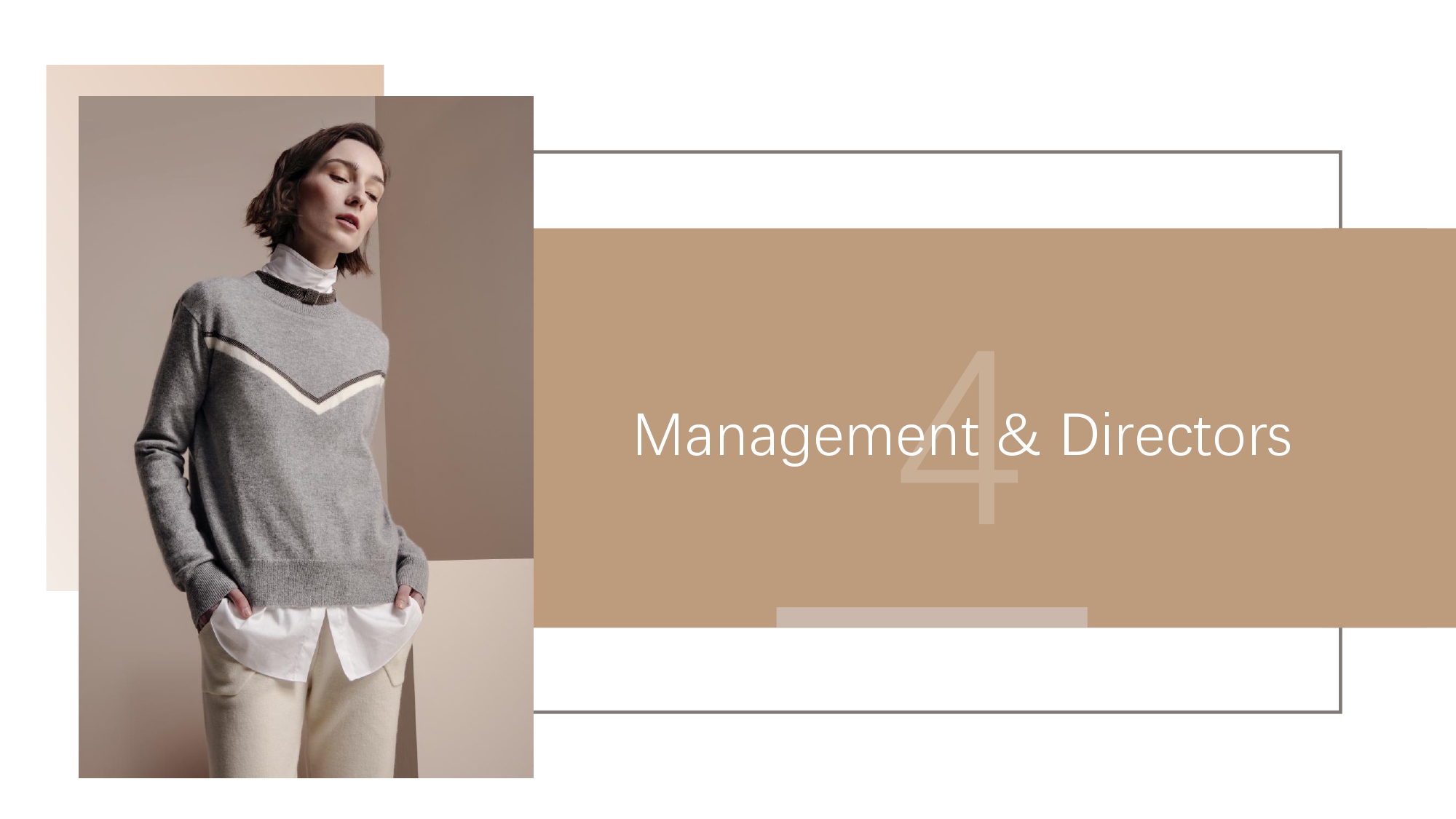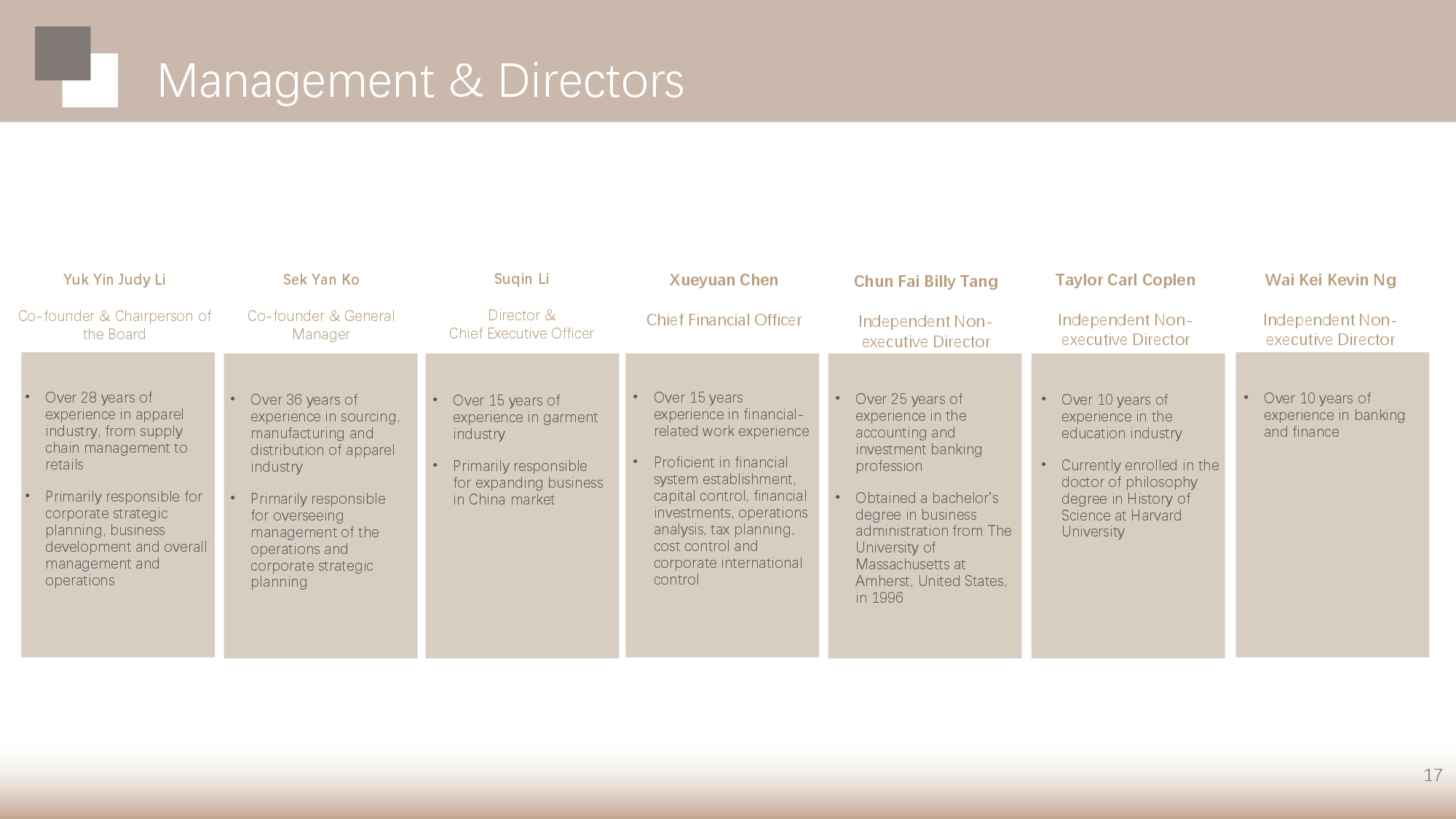 YUK Yin Judy Li Co-创始人兼董事会主席•超过28年的服装行业经验,从供应链管理到零售•主要负责企业战略规划、业务发展以及整体管理和运营Sek Yan Ko Co-创始人兼总经理•超过36年的采购经验,服装行业制造及分销•主要负责监督管理营运及企业战略规划李素琴董事兼行政总裁•逾15年服装行业经验•主要负责拓展中国市场管理及董事陈学远•逾15年财务相关工作经验•精通财务制度建立、资本管制、财务投资、营运分析、税务规划,成本控制和企业国际控制春辉Billy Tang独立非执行董事•在会计和投资银行专业拥有超过25年的经验•获得美国马萨诸塞大学阿默斯特分校工商管理学士学位,1996年Taylor Carl Coplen 17独立非执行董事• 10年以上教育行业经验•目前就读于哈佛大学科学史哲学博士Wai Kei Kevin Ng独立非执行董事• 10年以上银行和金融领域经验