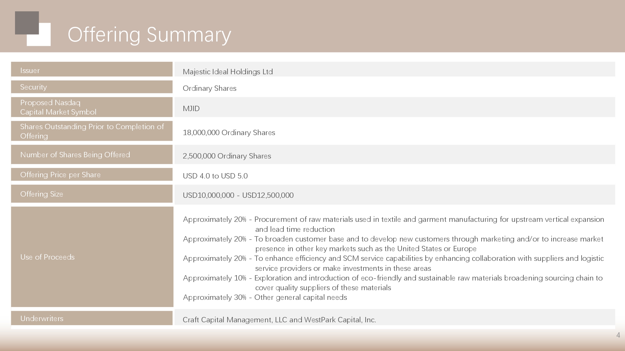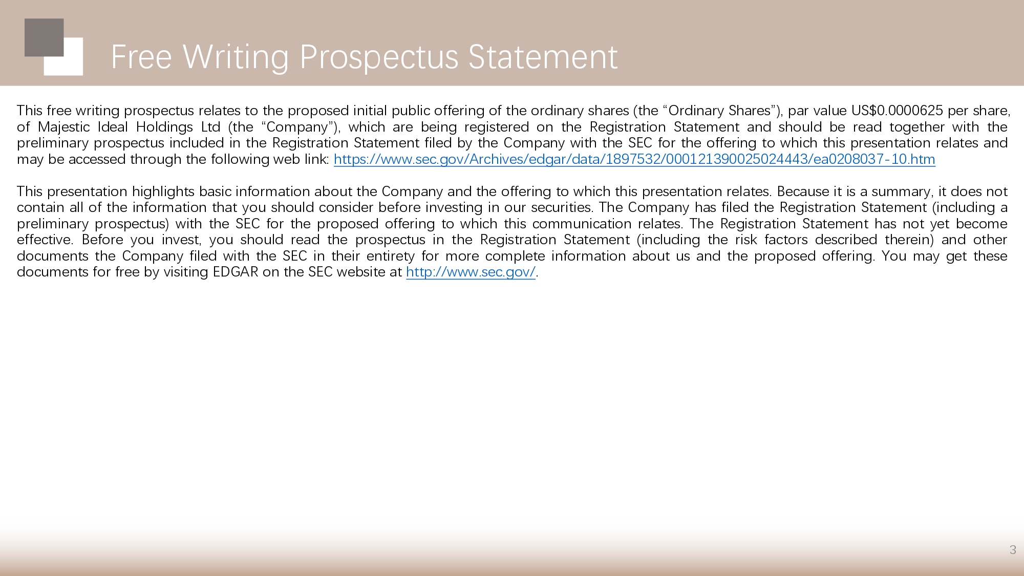Free Writing招股说明书声明3本Free Writing招股说明书涉及拟议的首次公开发行普通股(“普通股”),面值为0美元。Majestic Ideal Holdings Ltd(“公司”)的每股0000625,正在注册声明中注册,应与公司就本演示文稿所涉及的发售向SEC提交的注册声明中包含的初步招股说明书一起阅读,可通过以下网页链接访问:https://www.sec.gov/archives/edgar/data/1897532/000121390025024443/ea0208037-10。htm本演示文稿重点介绍了有关公司和本演示文稿所涉及的发售的基本信息。因为它是一个摘要,所以它没有包含您在投资我们的证券之前应该考虑的所有信息。公司已就本通讯所涉及的拟议发行向SEC提交了注册声明(包括初步招股说明书)。注册声明尚未生效。在您投资之前,您应该完整阅读注册声明中的招股说明书(包括其中描述的风险因素)以及公司向SEC提交的其他文件,以获得有关我们和拟议发行的更完整信息。您可以通过访问SEC网站http://www.sec.gov/上的EDGAR免费获得这些文件。