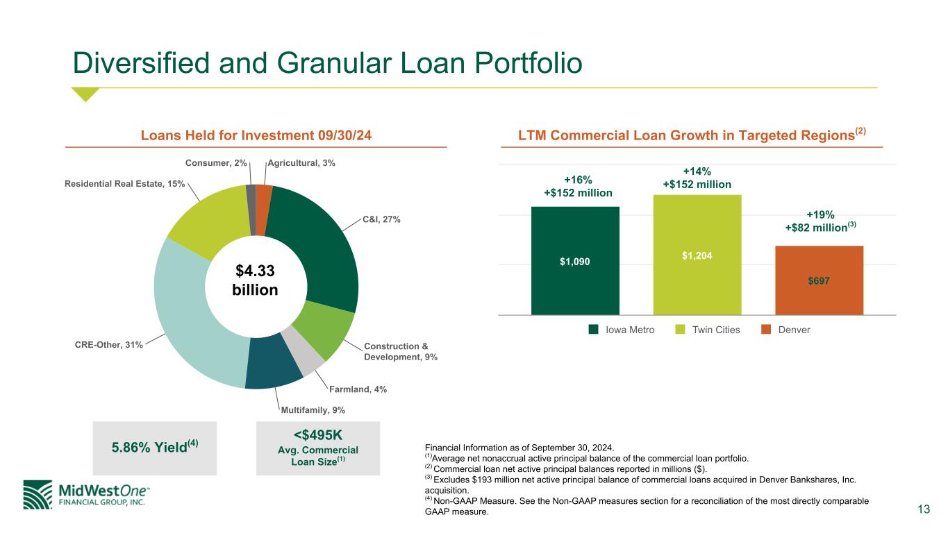 13项为投资而持有的多样化和颗粒度贷款组合贷款09/30/24农业、3% C & I、27%建筑与开发、9%农田、4%多户家庭、9% CRE-其他、31%住宅房地产、15%消费者、2% 43.3亿美元5.86%收益率(4)< 49.5万美元平均。商业贷款规模(1)截至2024年9月30日的财务信息。(1)商业贷款组合的平均净非应计主动本金余额。(2)商业贷款净活跃本金余额以百万计(美元)。(3)不包括在收购Denver Bankshares,Inc.中获得的商业贷款的1.93亿美元净主动本金余额。(4)非公认会计原则计量。有关最直接可比的GAAP衡量标准的对账,请参见Non-GAAP衡量标准部分。1090美元1204美元697美元爱荷华州地铁双城丹佛LTM目标地区商业贷款增长(2)+ 16% + 1.52亿美元+ 14% + 1.52亿美元+ 19% + 8200万美元(3)