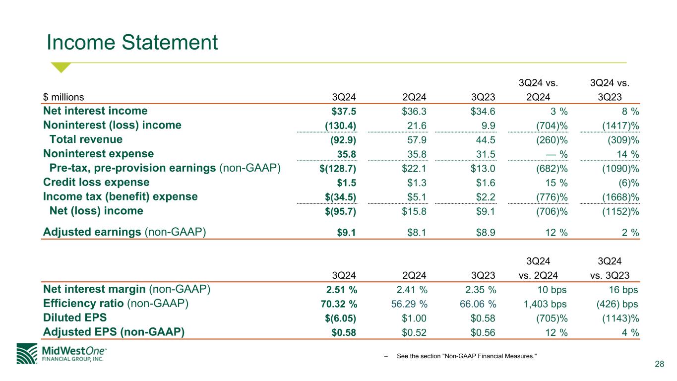 28损益表3Q24 vs. 3Q24 vs.百万美元3Q24 2Q24 3Q23 2Q24 3Q23净利息收入$ 37.5 $ 36.3 $ 34.63% 8%非利息(亏损)收入(130.4)21.69.9(704)%(1417)%总收入(92.9)57.94 4.5(260)%(309)%非利息费用35.8 35.83 1.5 —% 14%税前,拨备前利润(非美国通用会计准则)$(128.7)$ 22.1 $ 13.0(682)%(1090)%信用损失费用$ 1.5 $ 1.3 $ 1.615%(6)%所得税(收益)费用$(34.5)$ 5.1 $ 2.2(776)%(1668)%净(亏损)收入$(95.7)$ 15.8 $ 9.1(706)%(1152)%调整后收益(非美国通用会计准则)$ 9.1 $ 8.1 $ 8.9 12% 2% 3Q24 3Q24 3Q24 3Q24 3Q24 3Q23 vs. 2Q24 vs. 3Q23净息差(非美国通用会计准则)2.51% 2.41% 2.35% 10个基点16个基点效率比(非美国通用会计准则)70.32% 56.29% 66.06% 1,403个基点(426)个基点稀释后每股收益$(6.05)$$ 0.52 $ 0.56 12% 4% –见“非GAAP财务指标”一节。