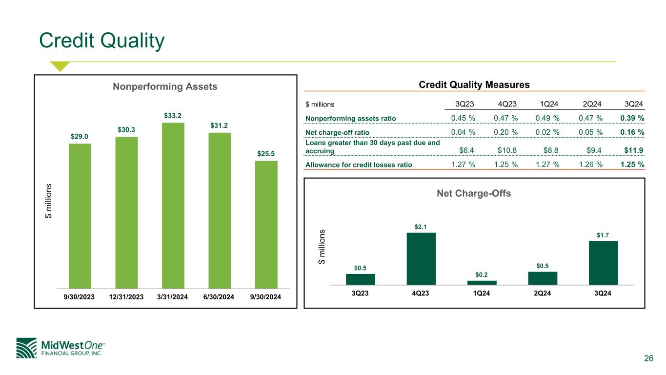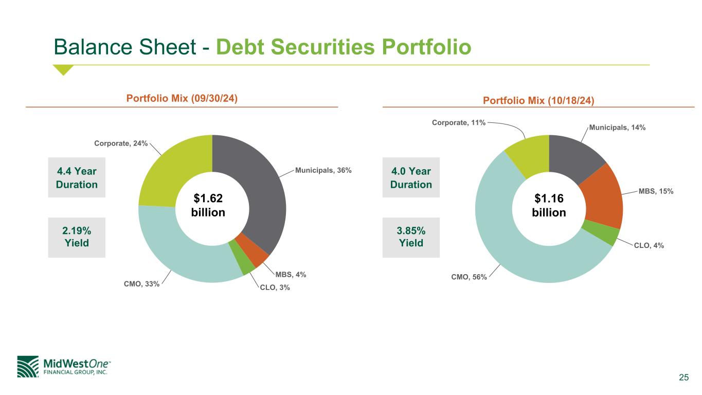 25资产负债表-债务证券组合组合组合(09/30/24)4.4年期限2.19%收益率市政、36% MBS、4% CLO、3% CMO、33%公司、24% 16.2亿美元投资组合组合(10/18/24)市政、14% MBS、15% CLO、4% CMO、56%公司、11% 4.0年期限3.85%收益率11.6亿美元