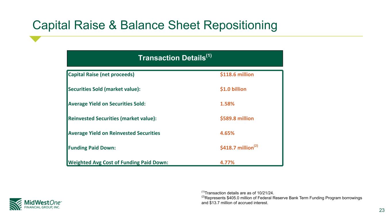 23融资&资产负债表重新定位融资(净收益)1.186亿美元已售证券(市值):10.00亿美元已售证券平均收益率:1.58%再投资证券(市值):5.898亿美元再投资证券平均收益率4.65%已付资金:4.187亿美元(2)已付加权平均融资成本:4.77%交易详情(1)(1)交易详情截至10/21/24。(2)代表4.05亿美元的联邦储备银行定期融资计划借款和1370万美元的应计利息。