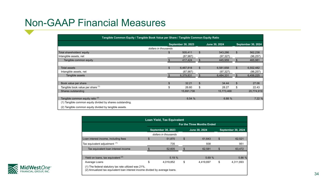 36非美国通用会计准则财务指标截至2023年9月30日止三个月的平均有形权益回报率2024年6月30日2024年9月30日千美元净(亏损)收入$ 9,138 $ 15,819 $(95,707)无形摊销,税后净额(1)1,0951,1951,090有形净(亏损)收入$ 10,233 $ 17,014 $(94,617)平均股东权益$ 508,066 $ 533,994 $ 551,414平均无形资产,净额(88,699)(99,309)(96,706)平均有形权益$ 419,367 $ 434,685 $ 454,708平均权益回报率7.14% 11.91%(69.05)%平均有形权益回报率(2)9.68% 15.74%(82.78)%(1)使用的所得税率为混合边际税率。(2)年化有形净收益除以平均有形权益。净利息收益率,截至2023年9月30日止三个月的税后等值2024年6月30日2024年9月30日千美元净利息收入34,575美元36,347美元37,521美元税后等值调整:贷款(1)735938951证券(1)432377365净利息收入,税后等值35,742美元37,662美元38,837美元平均生息资产6,032,636美元6,282,494美元6,167,525美元净息差,税后等值(2)2.35% 2.41% 2.51%(1)采用的联邦法定税率为21%。(2)年化税收等值净利息收入除以平均生息资产。