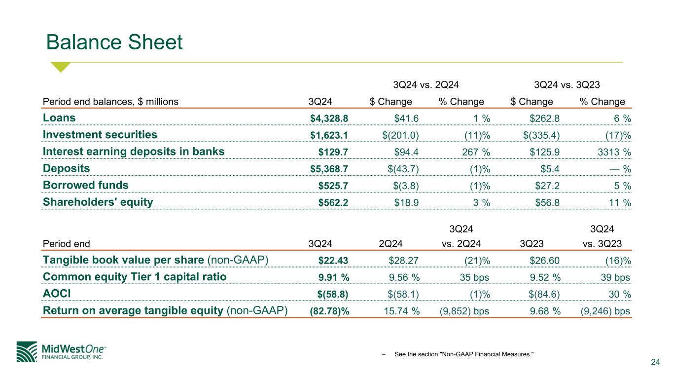 24资产负债表3Q24 vs. 2Q24 3Q24 vs. 3Q23期末余额,百万美元3Q24 $变动%变化$变动%变化贷款$ 4,328.8 $ 41.61% $ 262.86%投资证券$ 1,623.1 $(201.0)(11)% $(335.4)(17)%银行生息存款$ 129.7 $ 94.4 267% $ 125.9 3313%存款$ 5,368.7 $(43.7)(1)% $ 5.4 —%借入资金$ 525.7 $(3.8)(1)% $ 27.25%股东权益$ 562.2 $ 18.93% $ 56.811% 3Q24 3Q24期末3Q24 2Q24 vs. 2Q24 3Q23 vs. 3Q23每股有形账面价值(非公认会计准则)$ 22.43 $ 28.27(21)% $ 26.60(16)%普通股一级资本比率9.91% 9.56%35bps 9.52% 39bps AOCI $(58.8)$(58.1)(1)% $(84.6)30%平均有形资产回报率(非公认会计原则)(82.78)% 15.74%(9,852)bps 9.68%(9,246)bps –见“非公认会计原则财务措施”一节。