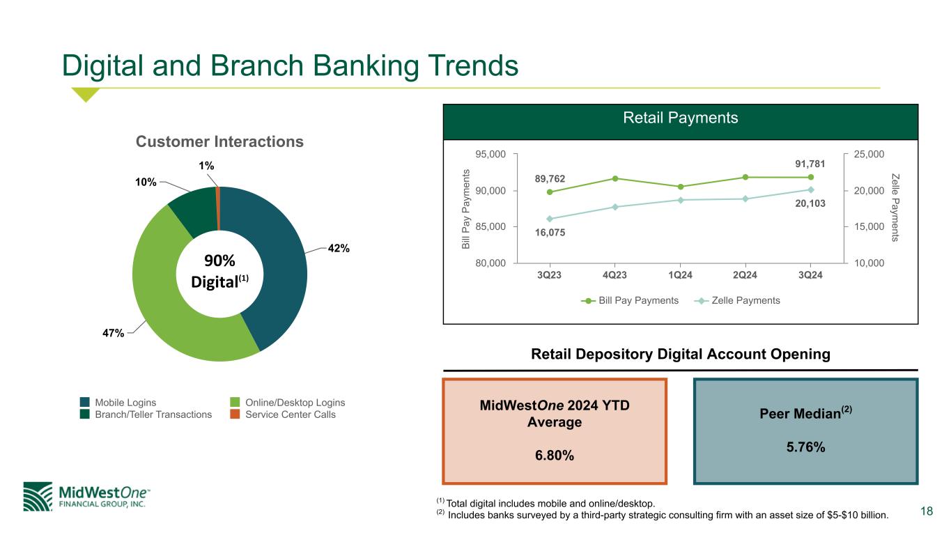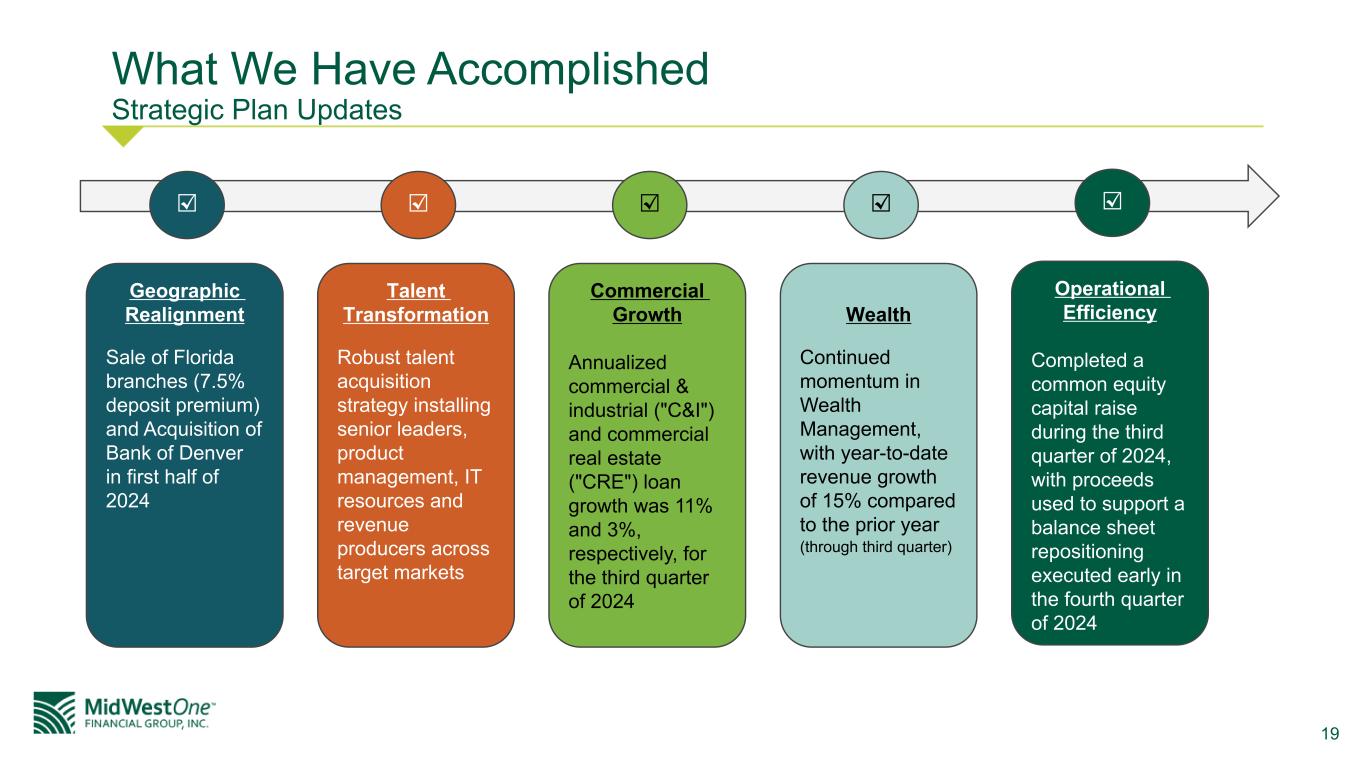 18数字化和分行银行趋势(1)总数字化包括移动和在线/桌面。(2)包括接受第三方战略咨询公司调查的资产规模在50-100亿美元的银行。客户互动42% 47% 10% 1%移动登录在线/桌面登录网点/柜员交易服务中心调用90%数字(1)B病P ay P ay M en ts Zelle P aym ents 89,76291,78116,07520,103账单支付支付Zelle Payments 3Q23 4Q23 1Q24 2Q24 3Q24 80,00085,00090,00095,00010,00015,00020,00025,000零售支付MidWestOne 2024 YTD平均6.80%同行中位数(2)5.76%零售存管数字开户