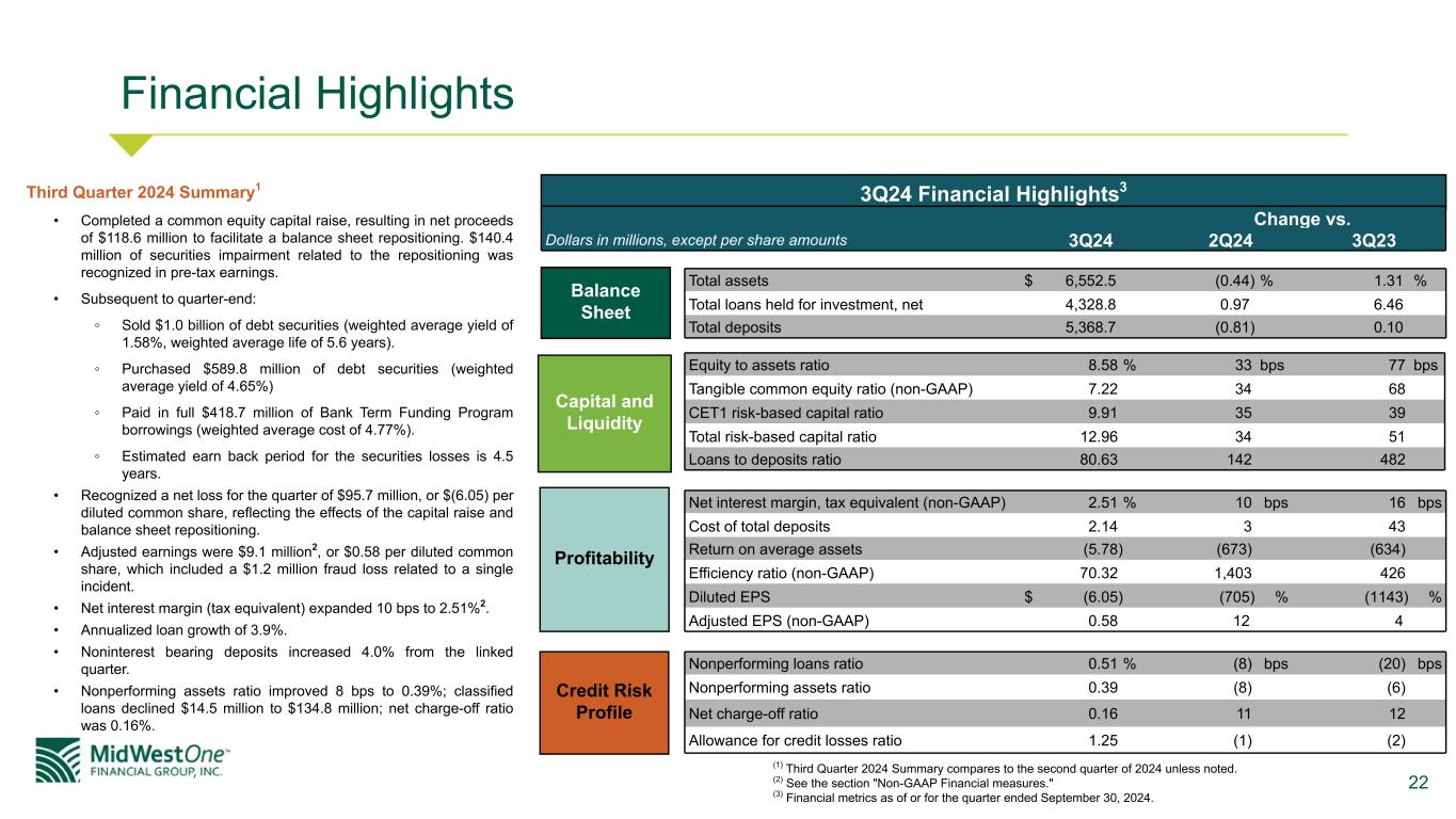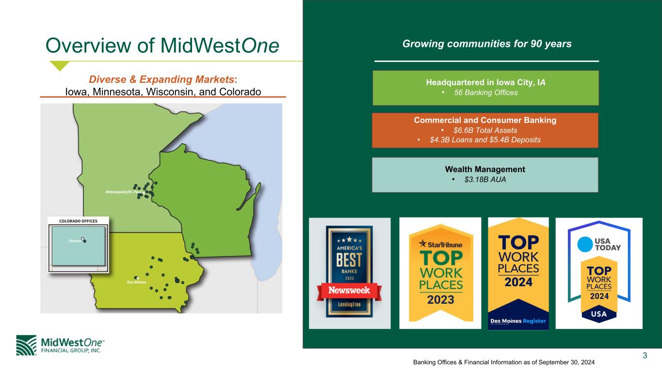 2前瞻性陈述&非GAAP措施关于前瞻性陈述的注意事项本演示文稿包含1995年《私人证券诉讼改革法案》中此类术语含义内的某些“前瞻性陈述”。我们和我们的代表可能会不时做出“前瞻性”的书面或口头陈述,并提供历史信息以外的信息。这些陈述涉及已知和未知的风险、不确定性和其他因素,这些因素可能导致实际结果与任何前瞻性陈述明示或暗示的任何结果、活动水平、业绩或成就存在重大差异。除其他外,这些因素包括下列因素。前瞻性陈述可能基于我们管理层的信念、预期和假设以及管理层目前可获得的信息,通常可以通过使用诸如“相信”、“预期”、“预期”、“应该”、“可能”、“将”、“计划”、“目标”、“打算”、“项目”、“估计”、“预测”、“可能”或类似表达等词语来识别。这些前瞻性陈述受到某些风险和不确定性的影响,这些风险和不确定性可能导致实际结果与这些陈述中表达或暗示的结果存在重大差异。告诫读者不要过分依赖任何此类前瞻性陈述,这些陈述仅在作出之日起生效。此外,我们不承担根据新信息或未来事件更新任何声明的义务,除非联邦证券法要求。我们预测结果或未来计划或战略的实际效果的能力本质上是不确定的。可能对我们实现经营业绩、增长计划目标和未来前景的能力产生影响的因素包括但不限于以下方面:(1)合并或分支机构出售(包括最近出售我们的佛罗里达银行业务和收购Denver Bankshares,Inc.)的风险,包括但不限于实施此类交易的相关时间和成本,将业务整合为这些交易的一部分,以及可能无法从此类交易中实现预期收益、收入增长和/或费用节省;(2)信贷质量恶化,房地产市场价值明显且持续降低,或其他不确定因素,包括通胀压力对经济状况和我们业务的影响,导致信贷损失准备金增加,信贷损失费用增加,净收益减少;(3)利率变化的影响,包括对我们的净收入和证券投资组合价值的影响;(4)经济环境、竞争、或其他可能影响我们获得贷款的能力或影响贷款和存款的预期增长率以及贷款组合的质量和贷款和存款定价的因素;(5)我们的投资证券价值波动;(6)政府的货币和财政政策;(7)用于为贷款和存款定价的基准利率的变化和不确定性;(8)立法和监管变化,包括银行、证券、贸易和税收法律法规的变化及其由我们的监管机构适用,以及因应其他银行的失败而发生的任何变化;(9)吸引和留住在银行和金融服务方面有经验的关键高管和员工的能力;(10)信贷损失准备金是否足以吸收我们现有贷款组合中固有的实际损失金额;(11)我们成功适应技术变化以在市场上有效竞争的能力;(12)信贷风险和来自我们贷款组合中的集中(按地理区域和按行业)的风险;(13)来自其他商业银行、储蓄机构、抵押银行公司、消费金融公司的竞争影响,信用合作社、证券经纪公司、保险公司、货币市场和其他共同基金、金融科技公司,以及在我们的市场或其他地方经营或提供类似服务的其他金融机构;(14)建立信用损失备抵和估计抵押品和各种金融资产和负债的价值所依据的假设未能实现;(15)对利率敏感的存款的波动性;(16)操作风险,包括数据处理系统故障或欺诈;(17)资产/负债匹配风险和流动性风险;(18)现有或未来诉讼的成本、影响和结果;(19)一般经济、政治或行业状况的变化,国家,在国际上或在我们开展业务的社区,包括经济衰退的风险;(20)会计政策和做法的变化, 州和联邦监管机构以及财务会计准则委员会可能采用的;(21)战争或恐怖活动,包括持续的中东冲突和俄罗斯入侵乌克兰、广泛的疾病或流行病,或其他不利的外部事件,可能导致经济恶化或造成信贷市场不稳定;(22)发生欺诈活动、破坏或我们或我们的第三方供应商的信息安全控制失败或网络安全相关事件,包括由于使用人工智能和类似工具进行的复杂攻击;(23)征收关税或影响我们借款人的农产品或其他产品价值的其他国内或国际政府政策;(24)由于即将到来的2024年总统大选,联邦政策和监管机构可能发生变化;(25)某些客户的大额存款集中,包括那些余额超过当前FDIC保险限额的客户;(26)金融服务业近期发展和事件的影响,包括导致近期银行倒闭的短期内大规模存款提取;以及(27)公司提交的证券交易委员会文件中不时详述的其他风险因素。非GAAP衡量标准本演示文稿包含有形普通股权益、每股有形账面价值、有形普通股权益比率、贷款收益率、税收等值、效率比率、税前、拨备前收益、平均有形权益回报率、净息差、税收等值、调整后收益和调整后每股收益的非GAAP衡量标准。管理层认为,这些措施为投资者提供了有关公司盈利能力、财务状况和资本充足率的有用信息,与管理层评估公司财务业绩的方式一致。每项非GAAP衡量标准与最具可比性的GAAP衡量标准的对账必要时包含在非GAAP财务衡量标准部分。