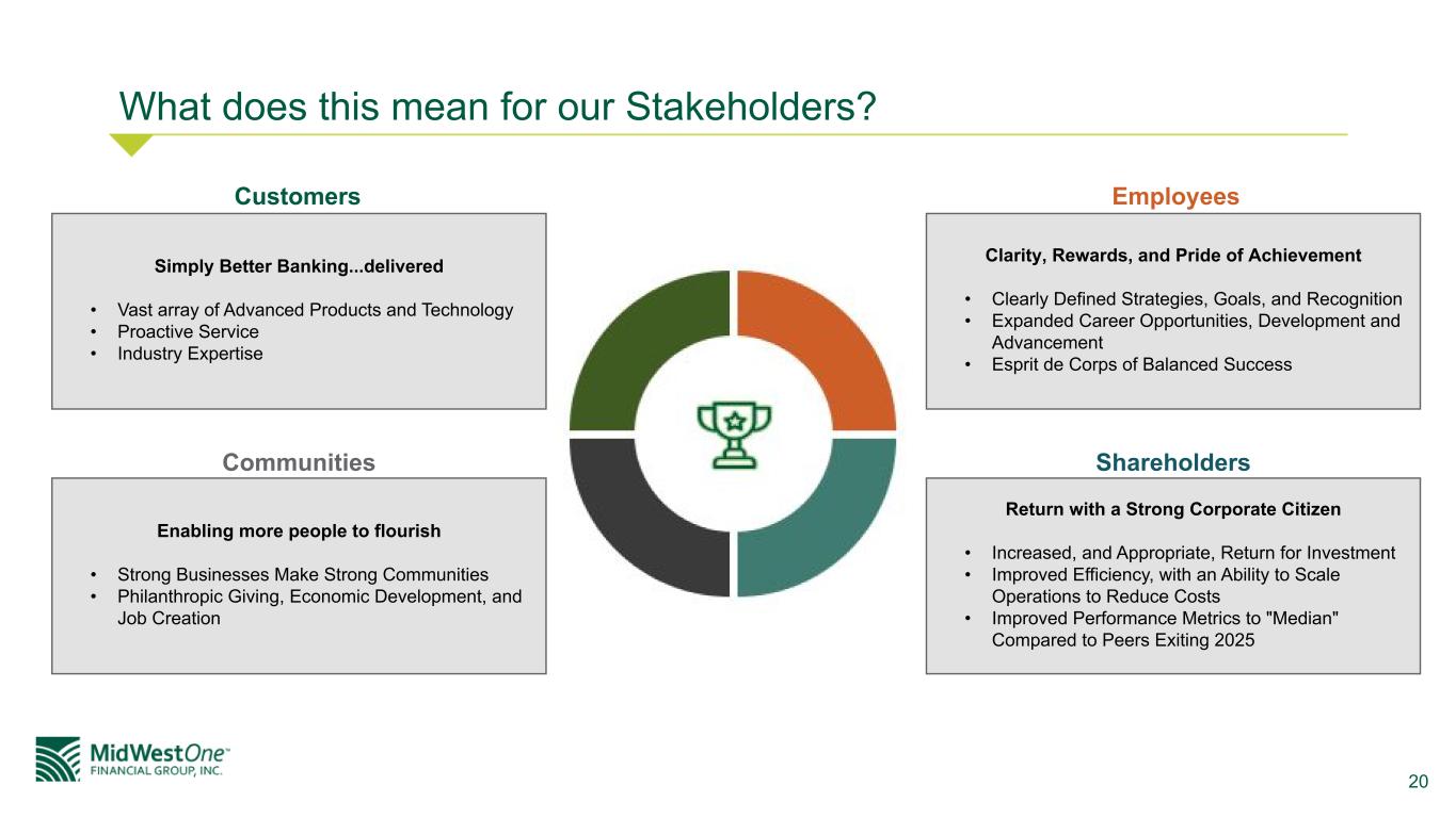20这对我们的利益相关者意味着什么?更好的银行...交付•大量先进产品和技术•主动服务•行业专长使更多人蓬勃发展•强企业造就强社区•慈善捐赠、经济发展和创造就业机会的清晰度、奖励和成就的自豪感•明确定义的战略、目标和认可•扩大了职业机会、发展和进步•平衡成功的Esprit de Corps以强大的企业公民回归•增加且适当的投资回报•提高效率,具有扩展运营以降低成本的Ability •与退出2025年客户的同行相比,绩效指标提高到“中位数”员工股东社区
