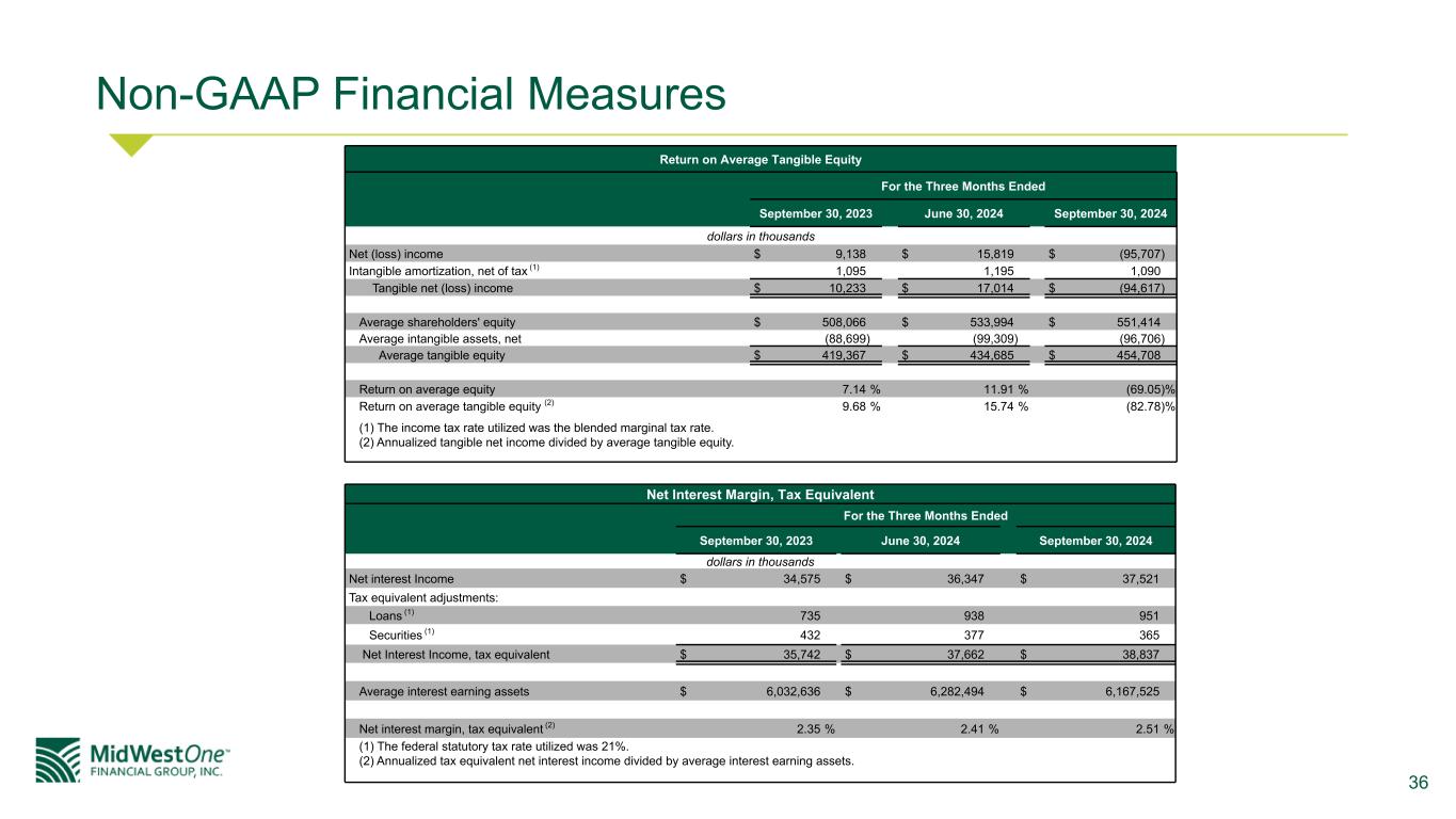 35截至2023年9月30日止三个月的非美国通用会计准则财务指标效率比率2024年6月30日2024年9月30日千美元非利息费用总额31,544美元35,761美元35,798美元无形资产摊销(1,460)(1,593)(1,470)与合并相关的费用(11)(854)(133)用于效率比率的非利息费用30,073美元33,314美元34,195美元净利息收入,税收等值(1)35,742美元37,662美元38,837美元非利息(亏损)收入9,86121,554(130,388)投资证券(亏损)收益,净额7933(140,182)净收益用于效率比率$ 45,524 $ 59,183 $ 48,631效率比率66.06% 56.29% 70.32%(1)使用的联邦法定税率为21%。(2)经无形资产摊销和并购相关费用调整后的非利息费用除以税收等值净利息收入、非利息(亏损)收入和净投资证券(亏损)收益之和。截至2023年9月30日止三个月的税前/拨备前净收入2024年6月30日2024年9月30日千美元净利息收入$ 34,575 $ 36,347 $ 37,521非利息(亏损)收入9,86121,554(130,388)非利息支出(31,544)(35,761)(35,798)税前/拨备前净收入$ 12,892 $ 22,140 $(128,665)
