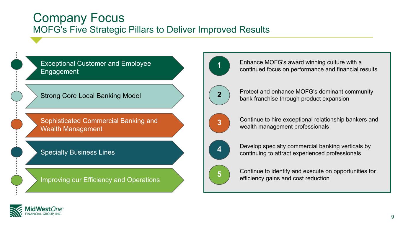8执行管理层推动变革Chip Reeves首席执行官Len Devaisher总裁兼首席运营官Barry Ray高级执行副总裁兼首席财务官 ■ 2022年11月加入MOFG担任首席执行官■ 2018-2022年担任Beach Bancorp,Inc.总裁兼首席执行官■ 2012-2017年担任喀斯喀特银行总裁兼首席运营官■曾在五三银行银行工作22年,担任执行副总裁,芝加哥商业银行业务和芝加哥市场总裁■ 2020年7月加入MOFG担任总裁兼首席运营官■ 2016-2019年担任Old National Bank威斯康辛地区首席执行官■ 2000年开始在Old National Bank从事商业银行业务,随后于2013-2016年担任多个业务领导职务■ 2018年6月加入MOFG担任首席财务官■ 2006-2018年在哥伦比亚州立银行担任多个职务,最近任首席财务官兼财务总监■ 2005-2006年在罗素投资集团担任业务分析师,2000-2005年在RSM US LLP担任咨询服务经理