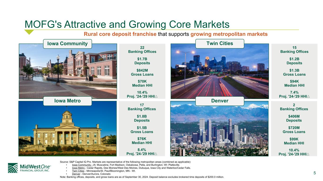 4我们的历史和增长概况总资产(百万美元)$ 5,875 $ 6,491 $ 6,468 $ 6,552 3Q21 3Q22 3Q23 3Q24贷款和存款(百万美元)$ 3,278 $ 3,762 $ 4,078 $ 4,345 $ 4,958 $ 5,477 $ 5,363 $ 5,369总贷款总存款3Q21 3Q22 3Q23 3Q24成立于1934年的爱荷华州银行信托公司。2008年,MidWestOne Financial Group,Inc.与ISB Financial Corp.合并,普通股在纳斯达克上市,股票代码为“MOFG”。2015年,MidWestOne收购了Central Bancshares,Inc.,将公司扩展到明尼阿波利斯-圣保罗地铁和西南佛罗里达。MidWestOne于2017年随团队升空扩展至科罗拉多州丹佛市。2019年收购ATBancorp,将MidWestOne扩展到Dubuque和Des Moines、IA和西南威斯康星州。2022年6月,MidWestOne收购了Iowa First Bancshares Corp.,2024年1月,MidWestOne收购了Denver Bankshares,Inc.,2024年6月,MidWestOne剥离了我们在佛罗里达州的银行业务。