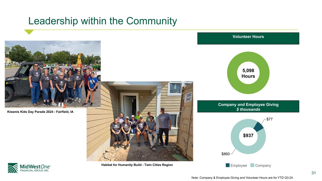 31社区内的领导力77美元860美元员工公司和员工捐赠数千美元注:公司和员工捐赠和志愿者时间为年初至今Q3 24志愿者时间5,098小时937美元Kiwanis儿童节游行2024年-爱荷华州费尔菲尔德Habitat for Humanity Build-双城地区
