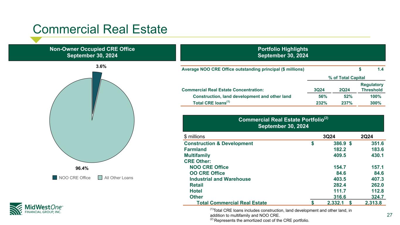 27商业地产3.6% 96.4% NOO CRE办公室所有其他贷款非自住CRE办公室2024年9月30日商业地产投资组合(2)2024年9月30日投资组合亮点2024年9月30日(1)CRE贷款总额包括建筑、土地开发和其他土地,此外还有多户和NOO CRE。(2)表示CRE组合的摊余成本。平均NOO CRE办公室未偿本金(百万美元)占总资本的1.4%商业地产集中度:3Q24 2Q24监管门槛建筑、土地开发和其他土地56% 52% 100% CRE贷款总额(1)232% 237% 300% $百万3Q24 2Q24 Construction & Development $ 386.9 $ 351.6 Farmland 18 2.2183.6 Multifamily 409.54 30.1 CRE Other:NOO CRE Office 154.7 157.1 OO CRE Office 84.68 4.6 Industrial and Warehouse 403.5407.3 Retail 28 2.4262.0 Hotel 111.71 12.8 Other 316.63 24.7 Total Commercial Real Estate $ 2,33 2.1 $ 2,313.8