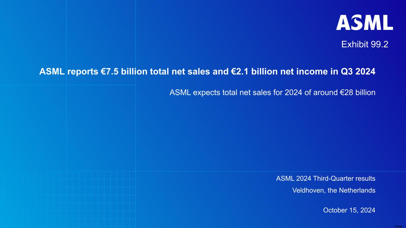 ASML 2024年第三季度业绩荷兰维尔德霍芬2024年10月15日丨ASML报告2024年第三季度总净销售额为75亿欧元,净收入为21亿欧元附件 99.2预计2024年的总净销售额约为280亿欧元