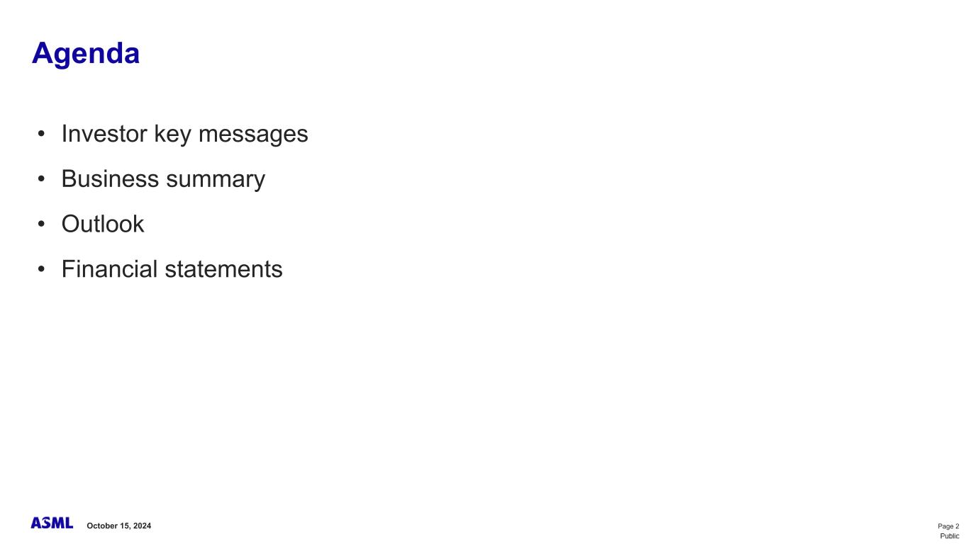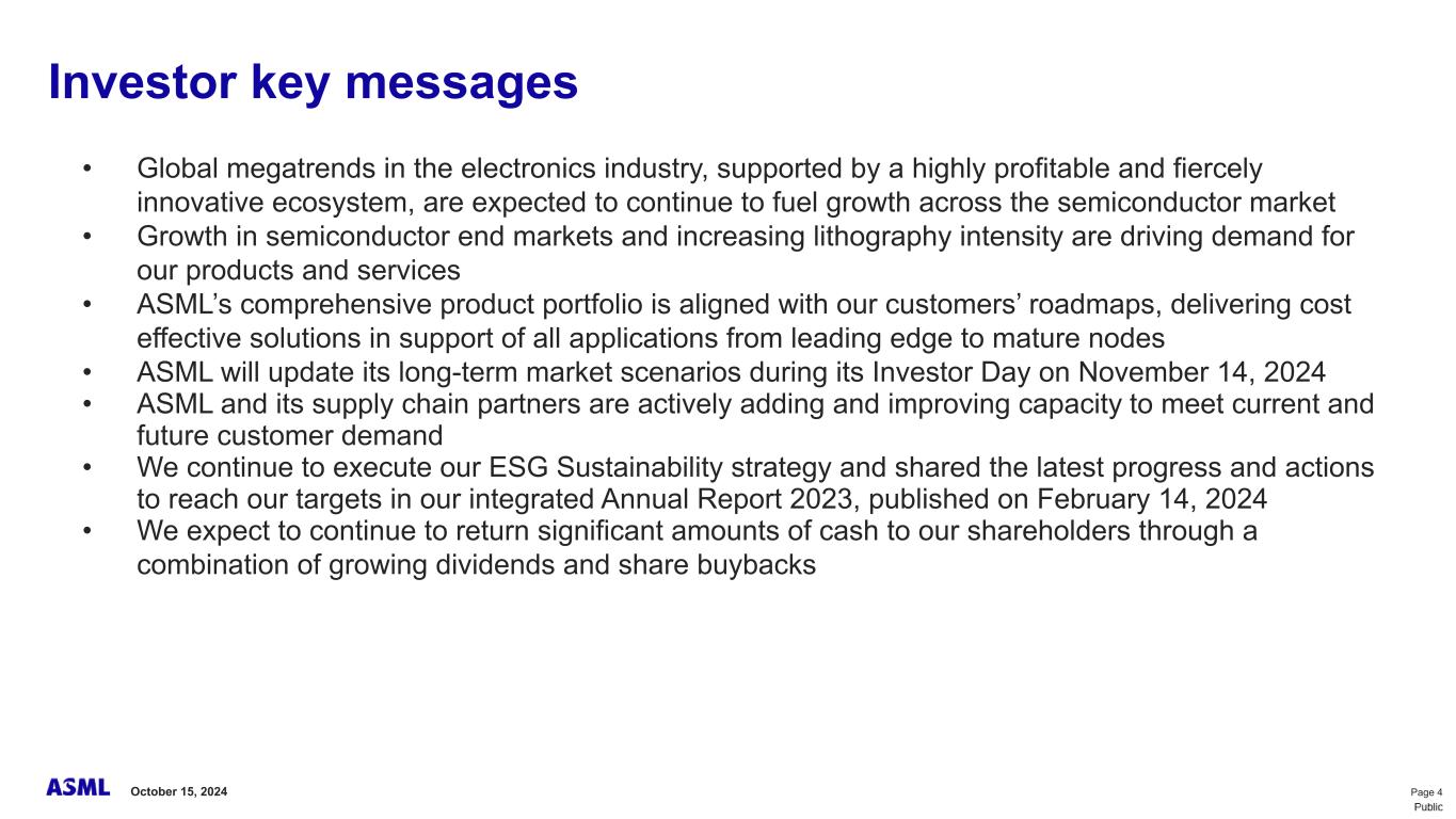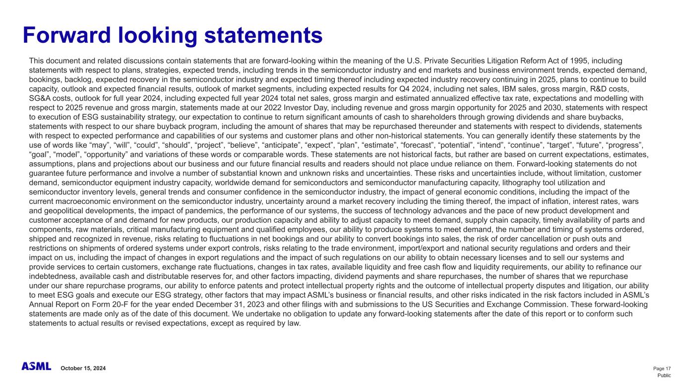 第17页2024年10月15日本文件和相关讨论包含1995年美国《私人证券诉讼改革法案》含义内的前瞻性陈述,包括有关计划、战略、预期趋势的陈述,包括半导体行业和终端市场的趋势以及商业环境趋势、预期需求、预订、积压、半导体行业的预期复苏及其预期时间,包括预期行业复苏将在2025年继续、继续建设产能的计划、前景和预期财务业绩、细分市场的前景,包括2024年第四季度的预期业绩,包括净销售额、IBM销售额、毛利率,研发成本、SG & A成本、2024年全年展望,包括预计2024年全年总净销售额、毛利率和估计的年化有效税率、对2025年收入和毛利率的预期和模型、在2022年投资者日发表的声明,包括2025年和2030年的收入和毛利率机会、关于执行ESG可持续发展战略的声明、我们期望通过不断增加的股息和股票回购继续向股东返还大量现金、关于我们的股票回购计划的声明,包括可能根据该协议回购的股份数量以及有关股息的报表、有关我们系统和客户计划的预期性能和能力的报表以及其他非历史报表。你一般可以通过使用“可能”、“将”、“可以”、“应该”、“项目”、“相信”、“预期”、“计划”、“估计”、“预测”、“潜在”、“打算”、“继续”、“目标”、“未来”、“进展”、“目标”、“机会”等词语来识别这些陈述,以及这些词语或类似词语的变体。这些陈述不是历史事实,而是基于当前对我们业务和未来财务业绩的预期、估计、假设、计划和预测,读者不应过分依赖它们。前瞻性陈述并不能保证未来的业绩,并涉及大量已知和未知的重大风险和不确定性。这些风险和不确定性包括但不限于客户需求、半导体设备行业产能、全球对半导体和半导体制造产能的需求、光刻工具利用率和半导体库存水平、半导体行业的一般趋势和消费者信心、总体经济状况的影响,包括当前宏观经济环境对半导体行业的影响、围绕市场复苏的不确定性,包括复苏的时间、通货膨胀、利率、战争和地缘政治发展的影响、流行病的影响、我们系统的性能,技术进步的成功和新产品开发的速度以及客户对新产品的接受和需求,我们的生产能力和调整能力以满足需求,供应链能力,零部件、原材料、关键制造设备和合格员工的及时可用性,我们生产系统以满足需求的能力,订购、发货和在收入中确认的系统的数量和时间,与净预订量波动相关的风险以及我们将预订量转化为销售额的能力,订单取消或推出的风险以及出口管制下已订购系统的发货限制、与贸易环境、进出口和国家安全法规和订单相关的风险及其对我们的影响,包括出口法规变化的影响以及此类法规对我们获得必要许可证以及向某些客户销售我们的系统和提供服务的能力的影响、汇率波动、税率变化、可用流动性和自由现金流以及流动性要求、我们为债务再融资的能力、可用现金和可分配准备金,以及其他影响因素、股息支付和股份回购、我们根据股份回购计划回购的股份数量、我们执行专利和保护知识产权的能力以及知识产权纠纷和诉讼的结果、我们实现ESG目标和执行ESG战略的能力、可能影响ASML的业务或财务业绩的其他因素,以及TERM20-F表格20-F年度报告中所载风险因素中提示的其他风险因素, 2023以及向美国证券交易委员会提交的其他文件和提交的文件。这些前瞻性陈述仅在本文件发布之日作出。除法律要求外,我们不承担在本报告发布之日后更新任何前瞻性陈述或使此类陈述符合实际结果或经修订的预期的义务。前瞻性陈述