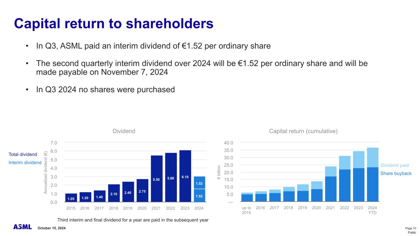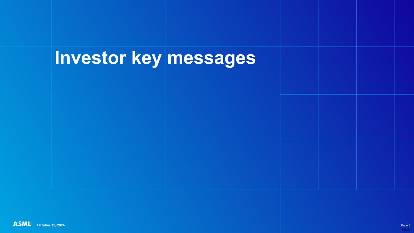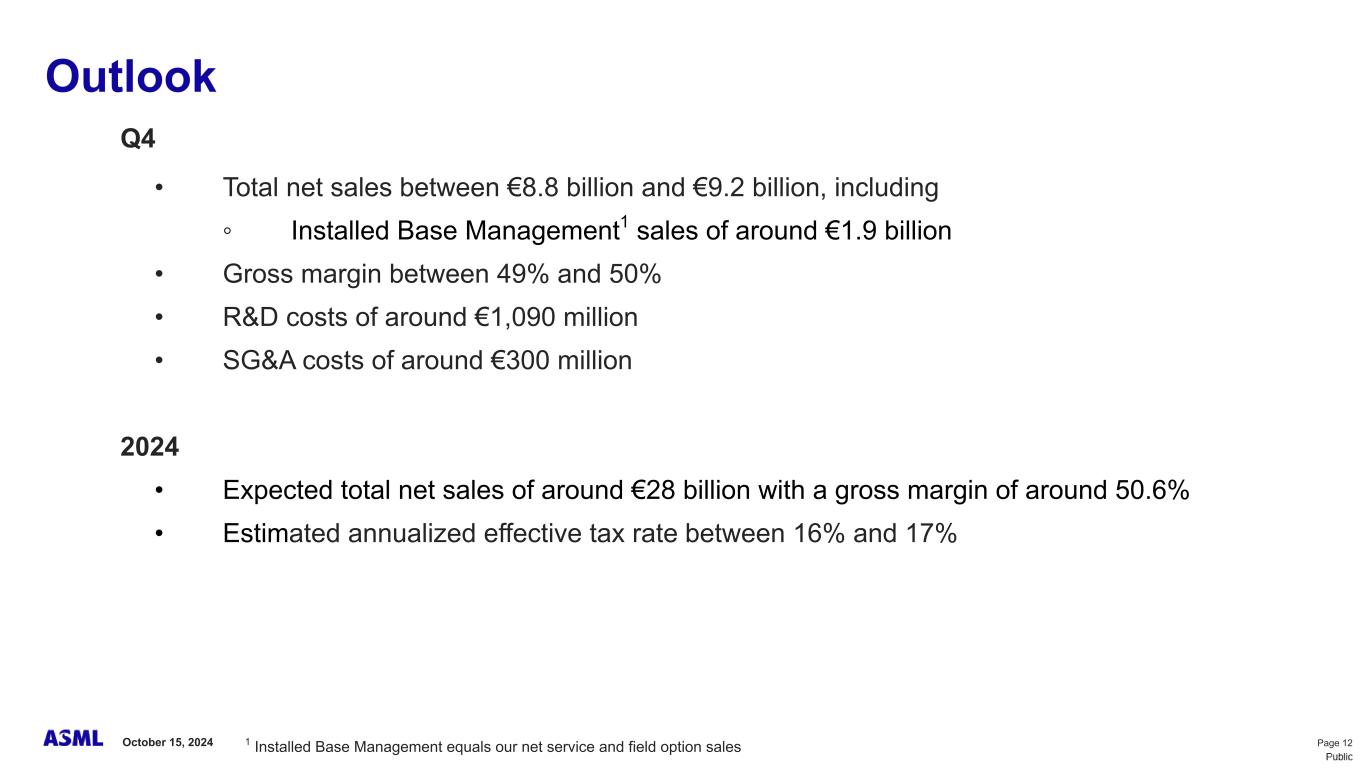 第17页2024年10月15日本文件和相关讨论包含1995年美国《私人证券诉讼改革法案》含义内的前瞻性陈述,包括有关计划、战略、预期趋势的陈述,包括半导体行业和终端市场的趋势以及商业环境趋势、预期需求、预订、积压、半导体行业的预期复苏及其预期时间,包括预期行业复苏将在2025年继续、继续建设产能的计划、前景和预期财务业绩、细分市场的前景,包括2024年第四季度的预期业绩,包括净销售额、IBM销售额、毛利率,研发成本、SG & A成本、2024年全年展望,包括预计2024年全年总净销售额、毛利率和估计的年化有效税率、对2025年收入和毛利率的预期和模型、在2022年投资者日发表的声明,包括2025年和2030年的收入和毛利率机会、关于执行ESG可持续发展战略的声明、我们期望通过不断增加的股息和股票回购继续向股东返还大量现金、关于我们的股票回购计划的声明,包括可能根据该协议回购的股份数量以及有关股息的报表、有关我们系统和客户计划的预期性能和能力的报表以及其他非历史报表。你一般可以通过使用“可能”、“将”、“可以”、“应该”、“项目”、“相信”、“预期”、“计划”、“估计”、“预测”、“潜在”、“打算”、“继续”、“目标”、“未来”、“进展”、“目标”、“机会”等词语来识别这些陈述,以及这些词语或类似词语的变体。这些陈述不是历史事实,而是基于当前对我们业务和未来财务业绩的预期、估计、假设、计划和预测,读者不应过分依赖它们。前瞻性陈述并不能保证未来的业绩,并涉及大量已知和未知的重大风险和不确定性。这些风险和不确定性包括但不限于客户需求、半导体设备行业产能、全球对半导体和半导体制造产能的需求、光刻工具利用率和半导体库存水平、半导体行业的一般趋势和消费者信心、总体经济状况的影响,包括当前宏观经济环境对半导体行业的影响、围绕市场复苏的不确定性,包括复苏的时间、通货膨胀、利率、战争和地缘政治发展的影响、流行病的影响、我们系统的性能,技术进步的成功和新产品开发的速度以及客户对新产品的接受和需求,我们的生产能力和调整能力以满足需求,供应链能力,零部件、原材料、关键制造设备和合格员工的及时可用性,我们生产系统以满足需求的能力,订购、发货和在收入中确认的系统的数量和时间,与净预订量波动相关的风险以及我们将预订量转化为销售额的能力,订单取消或推出的风险以及出口管制下已订购系统的发货限制、与贸易环境、进出口和国家安全法规和订单相关的风险及其对我们的影响,包括出口法规变化的影响以及此类法规对我们获得必要许可证以及向某些客户销售我们的系统和提供服务的能力的影响、汇率波动、税率变化、可用流动性和自由现金流以及流动性要求、我们为债务再融资的能力、可用现金和可分配准备金,以及其他影响因素、股息支付和股份回购、我们根据股份回购计划回购的股份数量、我们执行专利和保护知识产权的能力以及知识产权纠纷和诉讼的结果、我们实现ESG目标和执行ESG战略的能力、可能影响ASML的业务或财务业绩的其他因素,以及TERM20-F表格20-F年度报告中所载风险因素中提示的其他风险因素, 2023以及向美国证券交易委员会提交的其他文件和提交的文件。这些前瞻性陈述仅在本文件发布之日作出。除法律要求外,我们不承担在本报告发布之日后更新任何前瞻性陈述或使此类陈述符合实际结果或经修订的预期的义务。前瞻性陈述