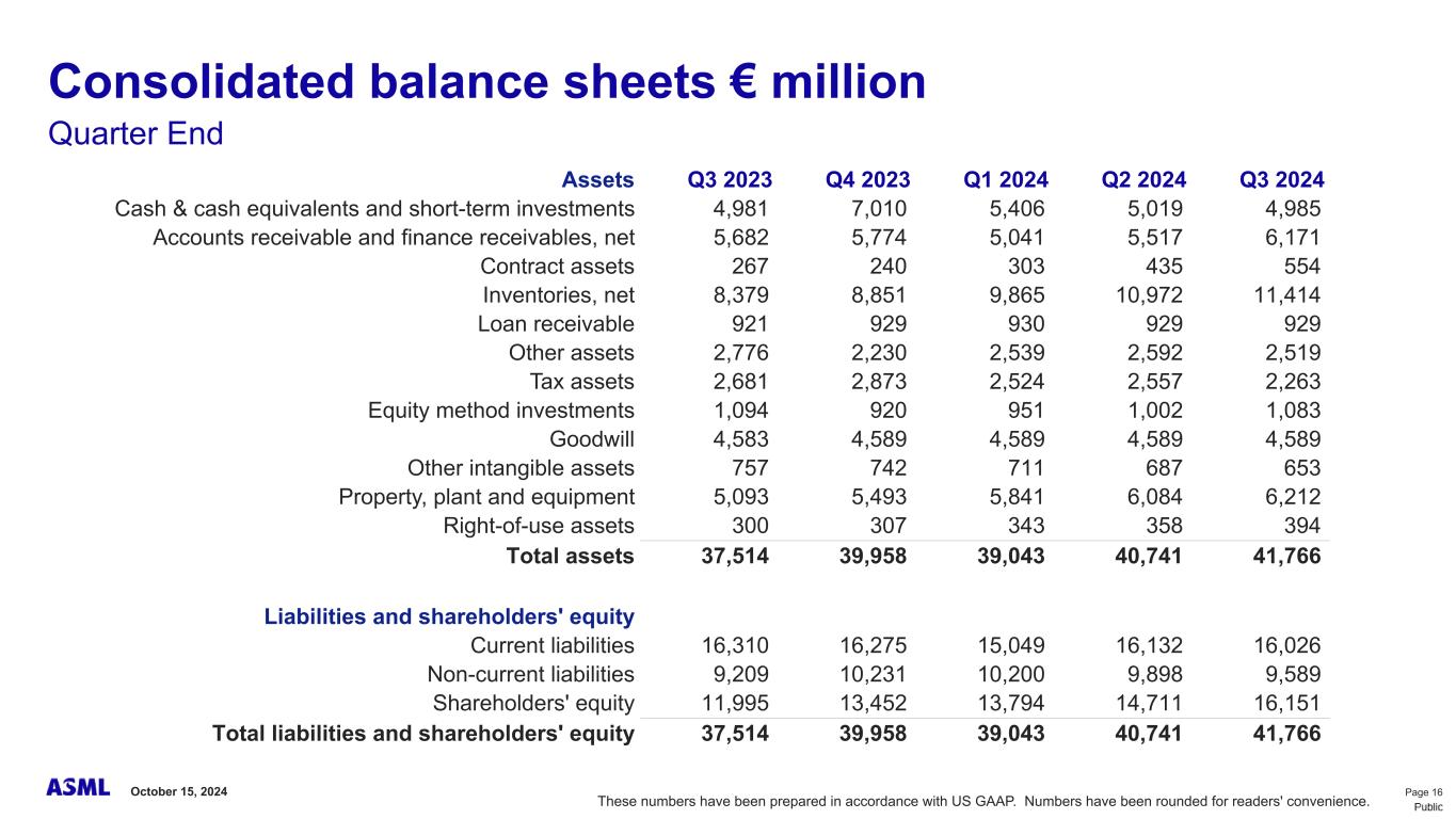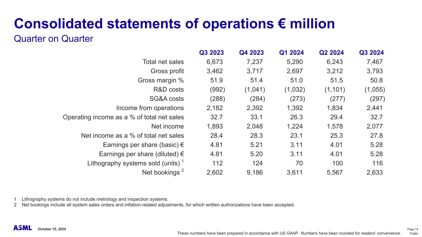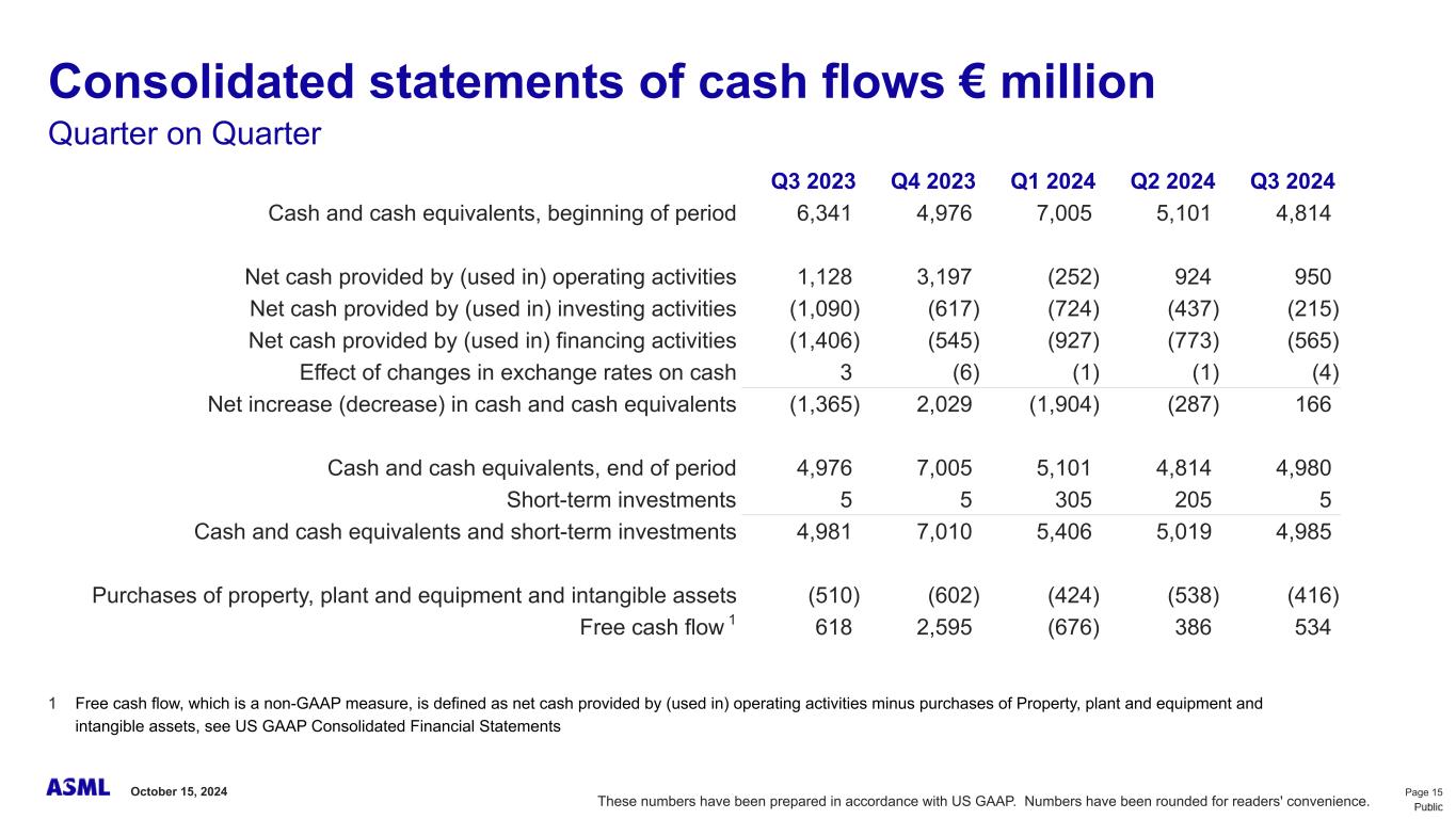 第14页10月15日,2024年合并经营报表百万欧元环比Q3 Q3 2023 Q4 2023 Q1 2024 Q2 2024 Q3 2024总净销售额6,6737,2375,2906,2437,467毛利润3,4623,7172,6973,2123,793毛利率% 51.95 1.45 1.05 1.55 0.8研发成本(992)(1,041)(1,032)(1,101)(1,055)SG & A成本(288)(284)(273)(277)(297)营业收入2,1822,3921,3921,8342,441营业收入占总净销售额的百分比32.73 3.1 26.32 9.43 2.7净收入1,8932,0481,2241,5782,077净收入占总净销售额的百分比28.428.32 3.125.3 27.8每股收益(基本)欧元4.81 5.21 3.11 4.01 5.28每股收益(稀释后)欧元4.81 5.20 3.11 4.01 5.28已售光刻系统(台)1111212470100116净预订量22,6029,1863,6115,5672,6331光刻系统不包括计量和检测系统。2净预订量包括所有系统销售订单和通胀相关调整,已接受书面授权。这些数字是根据美国通用会计准则编制的。为方便读者阅读,数字已四舍五入。