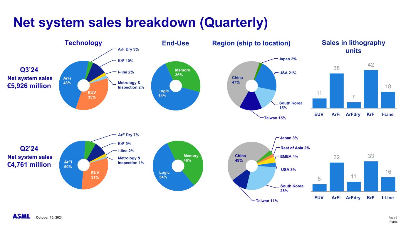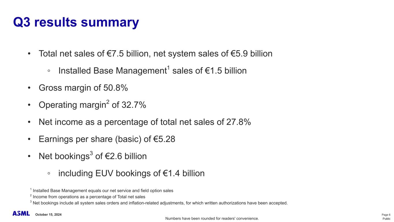 第6页2024年10月15日1已安装的基地管理等于我们的净服务和现场期权销售2运营收入占总净销售的百分比3净预订包括所有系统销售订单和与通货膨胀相关的调整,已接受书面授权。第三季度业绩摘要•总净销售额为75亿欧元,系统净销售额为59亿欧元⑤已安装的基础管理1销售额为15亿欧元•毛利率为50.8% •营业利润率2为32.7% •净收入占总净销售额的百分比为27.8% •每股收益(基本)为5.28欧元•净预订额3为26亿欧元⑤为方便读者阅读,已将包括EUV预订额为14亿欧元的数字四舍五入。