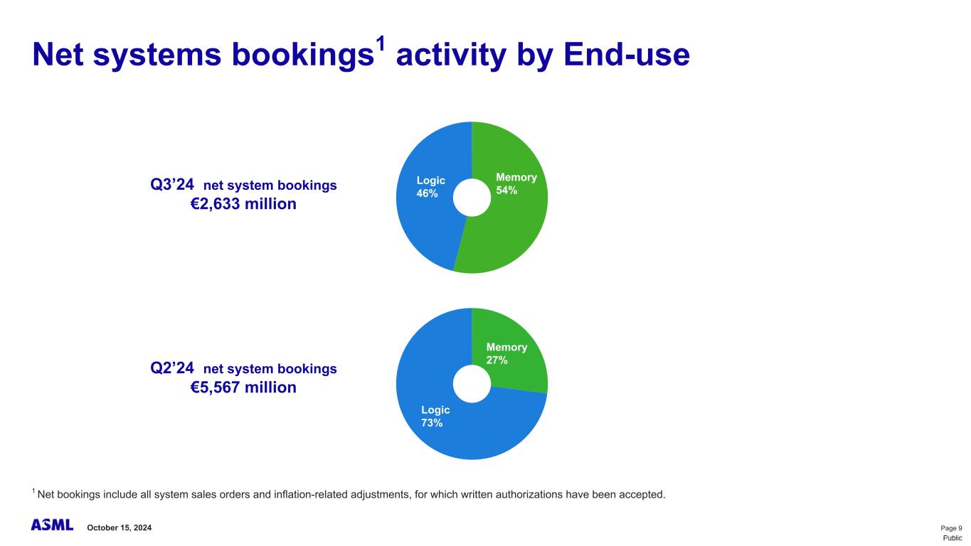 第9页2024年10月15日按最终用途划分的净系统预订1活动Q3’24净系统预订额26.33亿欧元Q2’24净系统预订额55.67亿欧元内存27%逻辑73% 1净预订额包括所有系统销售订单和与通货膨胀相关的调整,已接受书面授权。内存54%逻辑46%