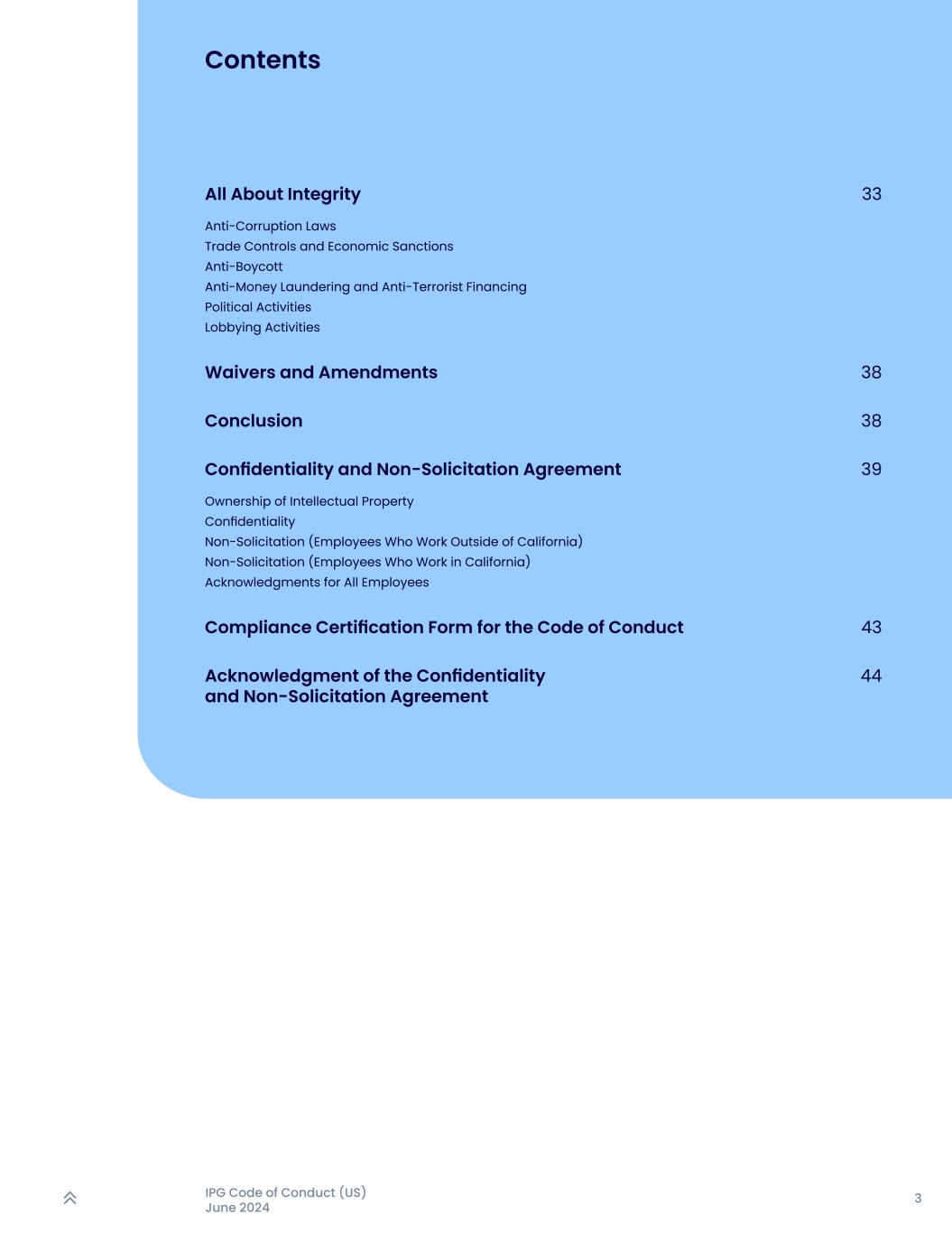 3IPG行为准则(美国)2024年6月All about integrity waivers and amendments compliance certification form for the code of conduct accreditation of the confidentiality and non-solicitation agreement conclusion confidentiality and non-solicitation agreement contents 333843443839 anti-corruption laws trade control and economic sanctions anti-boycott anti-money laundering and anti-terrorist financing political activities lobying activities ownership of intellectual property conf