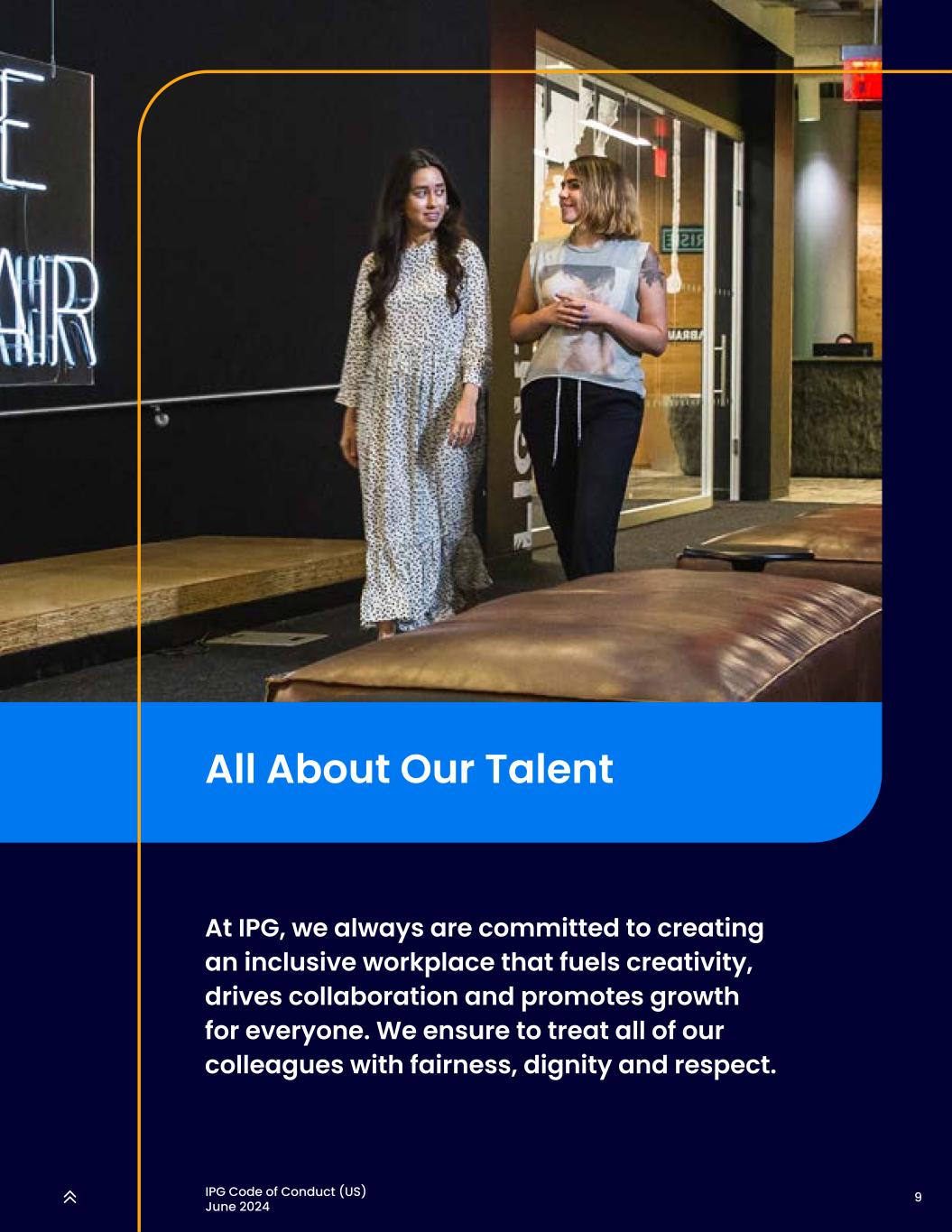 9IPG行为准则(美国)2024年6月All About Our Talent在IPG,我们始终致力于为每个人创造一个能够激发创造力、推动协作并促进成长的包容性工作场所。我们确保以公平、尊严和尊重的态度对待所有同事。