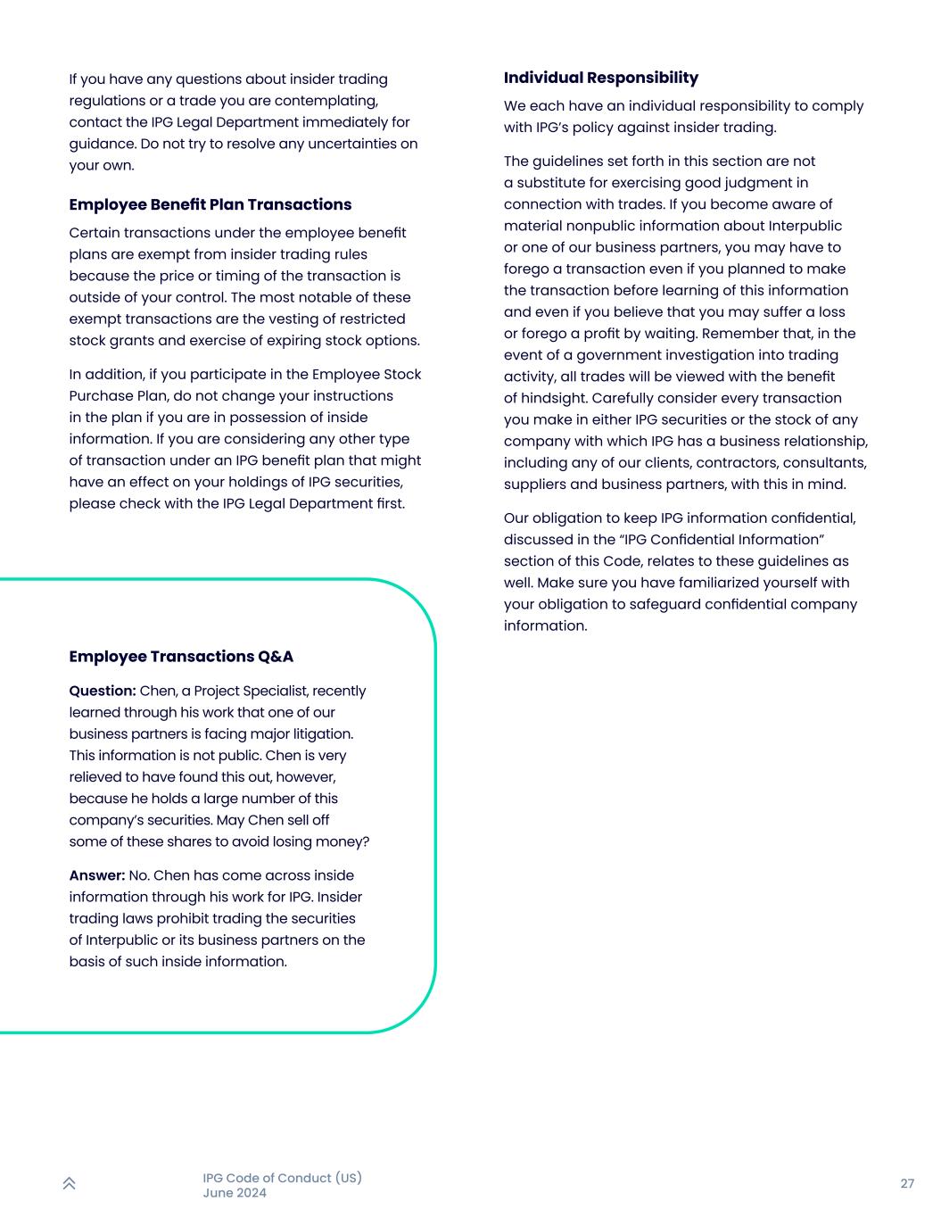 27IPG行为准则(美国)2024年6月个人责任我们每个人都有个人责任遵守IPG打击内幕交易的政策。本节所载的指引并不能取代就交易行使良好判断。如果您了解到有关InterPublic或我们的业务合作伙伴之一的重大非公开信息,即使您计划在获悉此信息之前进行交易,即使您认为您可能会因等待而蒙受损失或放弃收益,您也可能不得不放弃交易。请记住,如果政府对交易活动进行调查,所有交易都将事后诸葛亮地看待。考虑到这一点,请仔细考虑您在IPG证券或与IPG有业务关系的任何公司的股票中所做的每一笔交易,包括我们的任何客户、承包商、顾问、供应商和业务合作伙伴。我们在本准则“IPG机密信息”部分讨论的对IPG信息保密的义务也与本准则有关。确保你已经熟悉了你保护公司机密信息的义务。如果您对内幕交易监管或您正在考虑的交易有任何疑问,请立即联系IPG法务部寻求指导。不要试图自行解决任何不确定性。员工福利计划交易员工福利计划下的某些交易不受内幕交易规则的约束,因为交易的价格或时间超出了您的控制范围。这些豁免交易中最引人注目的是限制性股票授予的归属和到期股票期权的行使。另外,参与员工购股计划的,掌握内幕信息的不要更改计划中的指示。如果您正在考虑根据IPG福利计划进行的任何其他类型的交易,这些交易可能会对您持有的IPG证券产生影响,请您先向IPG法务部查询。员工交易问答提问:项目专员陈最近通过工作了解到,我们的一个业务合作伙伴面临重大诉讼。此信息不公开。然而,陈发现了这一点,他感到非常欣慰,因为他持有大量这家公司的证券。陈可否抛售其中部分股份以避免亏损?答:没有。陈某通过其在IPG的工作接触到了内幕信息。内幕交易法禁止基于此类内幕信息交易InterPublic或其业务合作伙伴的证券。