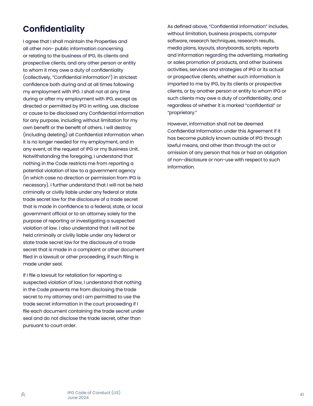 41IPG行为准则(美国)2024年6月保密我同意,在我受雇于IPG期间和之后的所有时间里,我将严格保密地维护与IPG、其客户和潜在客户以及可能对其负有保密义务的任何其他个人或实体有关的财产和所有其他非公开信息(统称“机密信息”)。本人在受聘于IPG期间或之后的任何时间,除经IPG书面指示或许可外,不得出于任何目的,包括但不限于为了本人或他人的利益,使用、披露或促使披露任何机密信息。当不再需要本人任职时,无论如何,应IPG或本人业务单位要求,本人将全部保密信息予以销毁(含删除)。尽管有上述规定,我的理解是,守则中的任何内容均未限制我向政府机构报告潜在的违法行为(在这种情况下,无需获得IPG的指示或许可)。我还进一步理解,根据任何联邦或州商业秘密法,我将不会因向联邦、州或地方政府官员或仅为报告或调查涉嫌违法行为而向律师秘密披露商业秘密而承担刑事或民事责任。我还理解,根据任何联邦或州商业秘密法,如果在诉讼或其他程序中提交的投诉或其他文件中披露商业秘密,我将不会被追究刑事或民事责任,如果此类提交是在密封状态下进行的。如果我因举报涉嫌违法行为而提起报复诉讼,我理解《守则》中没有任何内容阻止我向我的律师披露商业秘密,并且我被允许在法院程序中使用商业秘密信息,如果我将每一份包含商业秘密的文件都密封归档并且不披露商业秘密,除非根据法院命令。如上述定义,“机密信息”包括但不限于业务前景、计算机软件、研究技术、研究成果、媒体计划、版面、分镜、剧本、报告和有关产品的广告、营销或销售推广的信息,以及IPG或其实际或潜在客户的其他业务活动、服务和战略,无论这些信息是由IPG、其客户或潜在客户,还是由IPG或此类客户可能对其负有保密义务的其他个人或实体向本人提供的,无论是否标记为“机密”或“专有”。但是,如果信息是通过合法方式在IPG之外公开的,并且不是通过任何对此类信息负有不披露或不使用义务的人的作为或不作为而被视为本协议项下的保密信息。