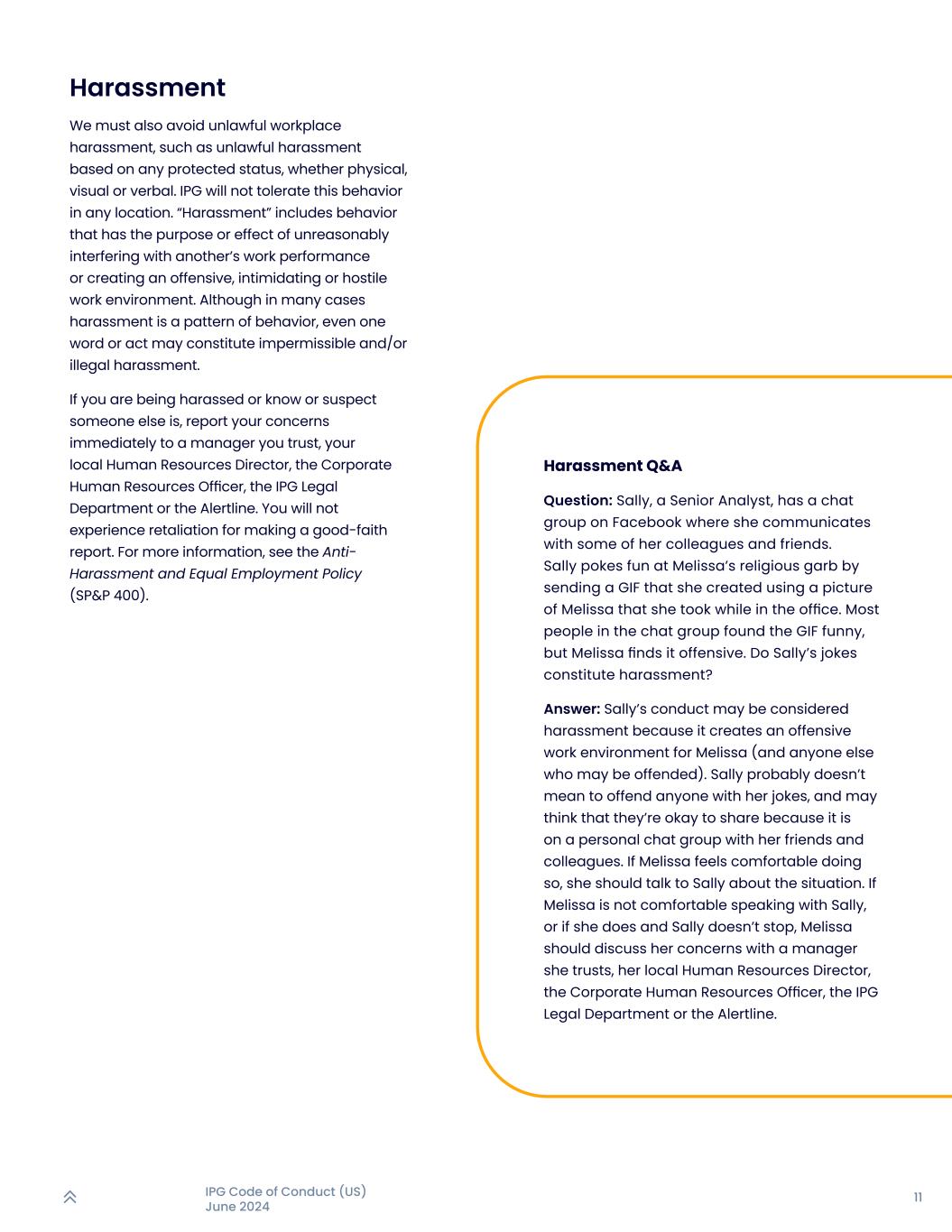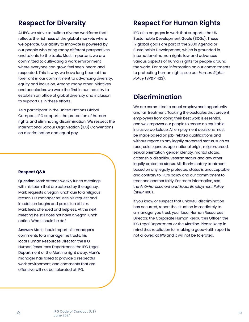 10IPG行为准则(美国)2024年6月尊重多样性在IPG,我们努力建立一支多元化的员工队伍,以反映我们经营所在的全球市场的丰富性。我们的创新能力是由我们的员工提供的,他们将许多不同的视角和人才带到了餐桌上。最重要的是,我们致力于培养一个每个人都能成长、感受到被看见、被听到和被尊重的工作环境。这就是为什么,我们长期以来一直在致力于推进多样性、公平和包容性方面走在前列。在许多其他倡议和荣誉中,我们是我们行业中第一个建立全球多样性和包容性办公室以支持我们这些努力的人。作为联合国全球契约的参与者,IPG支持保护人权和消除歧视。我们尊重国际劳工组织(ILO)关于歧视和同工同酬的公约。尊重问答问题:马克每周与他的团队一起参加由该机构提供服务的午餐会议。马克因宗教原因要求吃一顿纯素午餐。他的经理拒绝了他的要求,此外还嘲笑和取笑他。马克感到被冒犯和无助。在下一次会议上,他仍然没有素食午餐的选择。他该怎么办?答:Mark应该立即向他信任的经理、他当地的人力资源总监、IPG人力资源部、IPG法务部或Alertline报告他经理的评论。Mark的经理未能提供一个受人尊重的工作环境,IPG不会容忍令人反感的评论。尊重人权IPG还从事支持联合国可持续发展目标(SDGs)的工作。这17个全球目标是《2030年议程》或可持续发展的一部分,该议程以国际人权法为基础,推动世界各地人民人权的各个方面。有关我们保护人权的承诺的更多信息,请参阅我们的人权政策(SP & P 423)。歧视我们致力于平等就业机会和公平待遇。解决阻碍员工尽最大努力的障碍至关重要,我们赋予员工权力,以创造一个公平包容的工作场所。所有就业决定必须基于与工作相关的资格,不考虑任何受法律保护的身份,例如种族、肤色、性别、年龄、国籍、宗教、信仰、性取向、性别认同、婚姻状况、公民身份、残疾、退伍军人身份,以及任何其他受法律保护的身份。所有基于任何受法律保护身份的歧视性待遇都是不可接受的,并且违反了IPG的政策以及我们公平对待彼此的承诺。有关更多信息,请参阅反骚扰和平等就业政策(SP & P 400)。如果您知道或怀疑发生了非法歧视,请立即将情况报告给您信任的经理、当地的人力资源总监、公司人力资源官、IPG法务部或报警电话。请记住,善意举报的报复行为,在IPG是不允许的,也是不能容忍的。