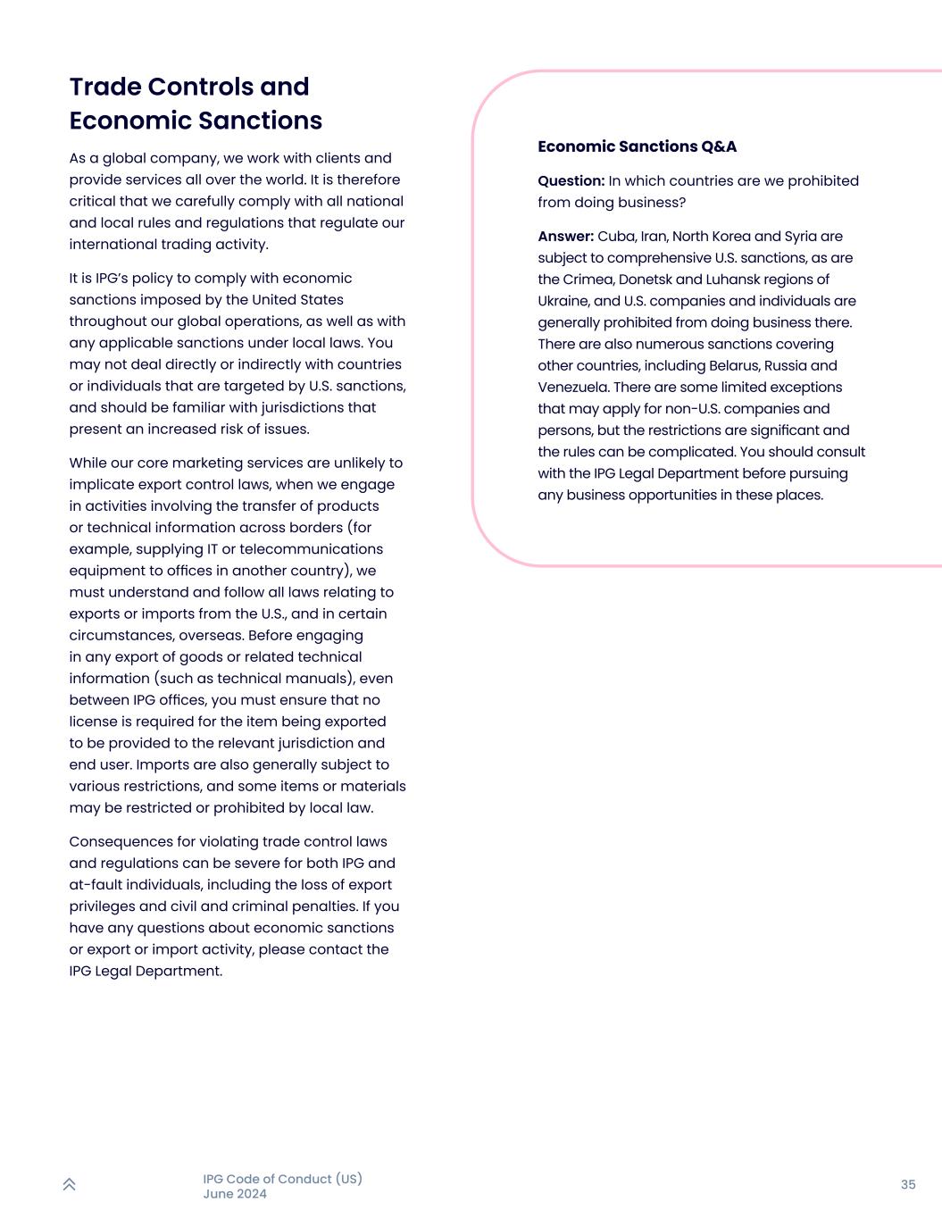 35IPG行为准则(美国)2024年6月经济制裁问答题:我们被禁止在哪些国家开展业务?答:古巴、伊朗、朝鲜和叙利亚受到美国的全面制裁,乌克兰的克里米亚、顿涅茨克和卢甘斯克地区也受到制裁,美国公司和个人一般被禁止在那里开展业务。其他国家也有众多制裁措施,包括白俄罗斯、俄罗斯和委内瑞拉。有一些有限的例外情况可能适用于非美国公司和个人,但限制很重要,规则可能很复杂。在这些地方寻求任何商机之前,您应该咨询IPG法务部。贸易管制和经济制裁作为一家全球性公司,我们与客户合作,并在世界各地提供服务。因此,至关重要的是,我们必须认真遵守所有规范我们国际贸易活动的国家和地方规则和规定。在我们的全球业务过程中遵守美国施加的经济制裁以及当地法律规定的任何适用制裁是IPG的政策。您可能不会直接或间接与美国制裁的目标国家或个人打交道,应熟悉出现问题风险增加的司法管辖区。虽然我们的核心营销服务不太可能涉及出口管制法律,但当我们从事涉及跨境转移产品或技术信息的活动(例如,向另一个国家的办事处提供IT或电信设备)时,我们必须了解并遵守所有与从美国出口或进口有关的法律,在某些情况下,还必须遵守海外法律。在从事任何货物出口或相关技术信息(如技术手册)之前,即使是在IPG办事处之间,您也必须确保向相关司法管辖区和最终用户提供所出口的物品无需许可证。进口也普遍受到各种限制,一些物品或材料可能受到当地法律的限制或禁止。对于IPG和有过错的个人而言,违反贸易管制法律法规的后果可能很严重,包括失去出口特权以及民事和刑事处罚。如对经济制裁或进出口活动有任何疑问,请与IPG法务部联系。