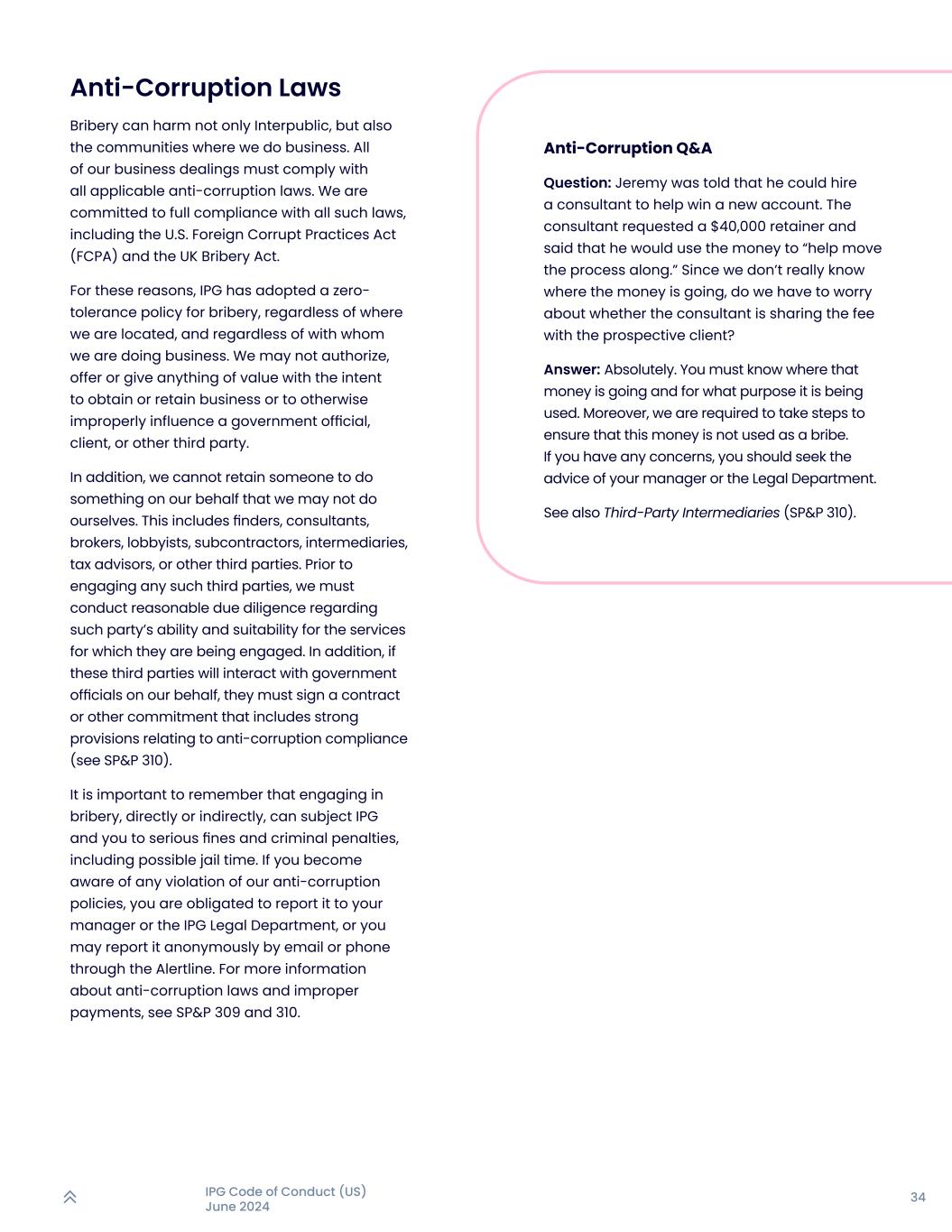 34IPG行为准则(美国)2024年6月反腐败问答提问:Jeremy被告知可以聘请顾问帮助赢得新账户。这位顾问要求获得4万美元的聘金,并表示他将用这笔钱“帮助推动这一进程”。既然我们并不真的知道钱的去向,那么我们是否要担心顾问是否在与潜在客户分摊费用呢?答:当然可以。你必须知道这些钱的去向,以及它被用于什么目的。此外,我们被要求采取措施,确保这笔钱不被用作贿赂。如果你有任何顾虑,你应该寻求你的经理或法律部门的建议。另见第三方中介机构(SP & P 310)。反腐败法贿赂不仅会伤害InterPublic,还会伤害我们开展业务的社区。我们所有的业务往来都必须遵守所有适用的反腐败法律。我们致力于全面遵守所有这些法律,包括美国《反海外腐败法》(FCPA)和英国《反贿赂法》。基于这些原因,IPG对贿赂行为采取了零容忍政策,无论我们在哪里,也无论我们和谁做生意。我们不得授权、提供或给予任何有价值的东西,意图获得或保留业务或以其他方式不正当地影响政府官员、客户或其他第三方。此外,我们不能挽留某人代我们做一些我们自己可能做不到的事情。这包括发现者、顾问、经纪人、说客、分包商、中介、税务顾问或其他第三方。在聘请任何此类第三方之前,我们必须对该方的能力和是否适合他们所从事的服务进行合理的尽职调查。此外,如果这些第三方将代表我们与政府官员互动,他们必须签署一份合同或其他承诺,其中包括与反腐败合规相关的强有力条款(见SP & P 310)。重要的是要记住,直接或间接地从事贿赂行为,可能会使IPG和你受到严重的罚款和刑事处罚,包括可能的监禁。如果您发现任何违反我们反腐败政策的行为,您有义务向您的经理或IPG法务部进行举报,也可以通过Alertline通过电子邮件或电话进行匿名举报。有关反腐败法律和不当支付的更多信息,请参见SP & P 309和310。