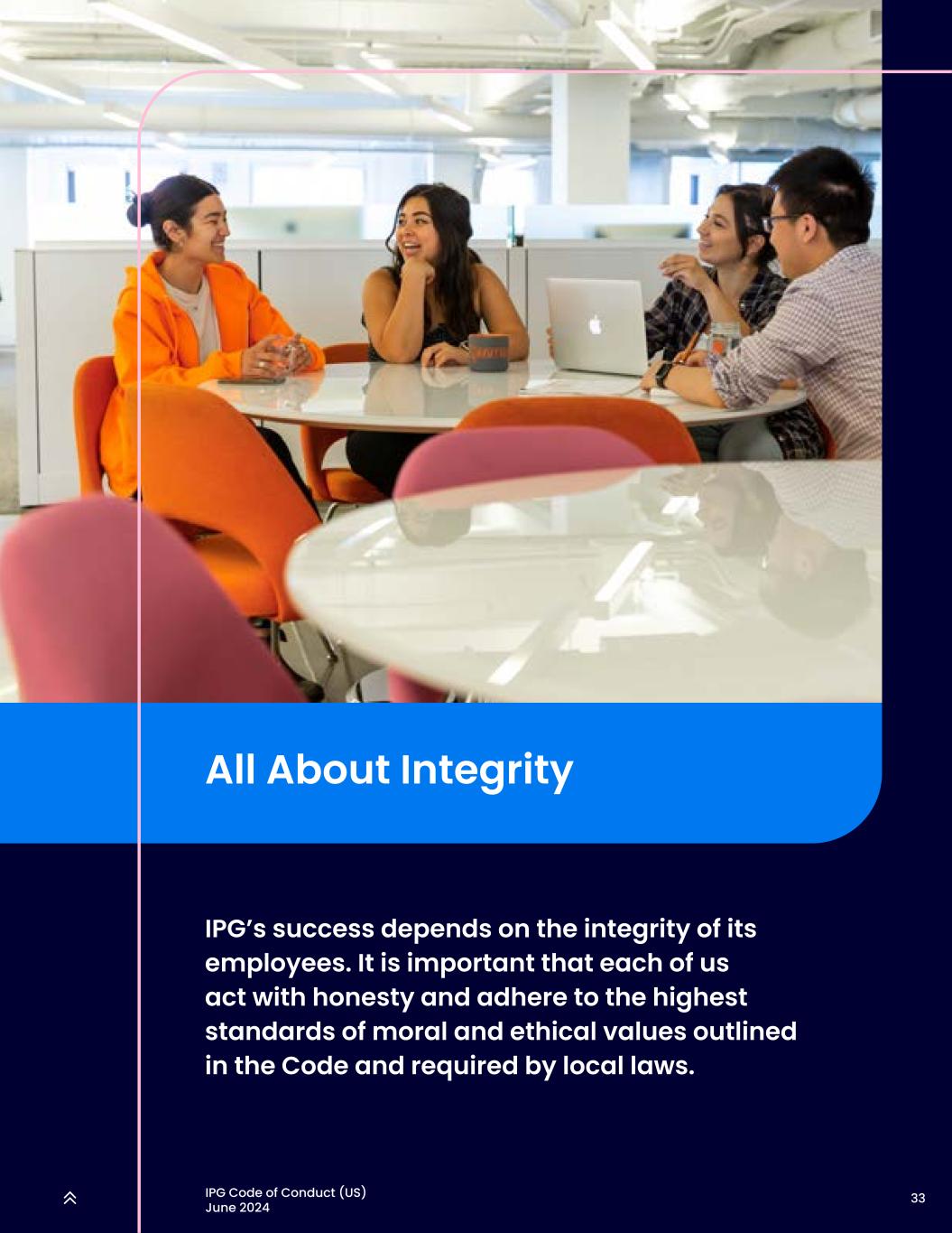 33IPG行为准则(美国)2024年6月一切关于诚信IPG的成功取决于员工的诚信。重要的是,我们每个人都要诚实行事,遵守《守则》中概述的和当地法律要求的最高标准的道德和伦理价值。