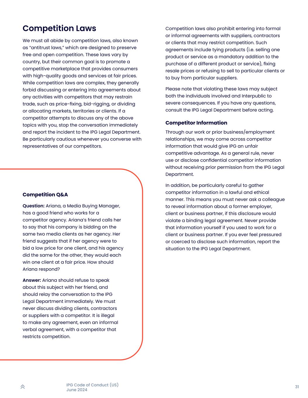 31IPG行为准则(美国)2024年6月竞争法我们都必须遵守竞争法,也被称为“反垄断法”,旨在维护自由和公开的竞争。这些法律因国家而异,但它们的共同目标是促进一个以公平价格为消费者提供高质量商品和服务的竞争性市场。虽然竞争法很复杂,但它们通常禁止与竞争对手就任何可能限制贸易的活动进行讨论或达成协议,例如操纵价格、操纵投标或划分或分配市场、领土或客户。如果有竞争对手试图与您讨论上述任何话题,请立即停止对话,并将该事件报告给IPG法务部。每当你与我们竞争对手的代表交谈时都要特别谨慎。竞争法还禁止与供应商、承包商或客户订立可能限制竞争的正式或非正式协议。这类协议包括搭售产品(即出售一种产品或服务,作为购买不同产品或服务的强制性补充)、确定转售价格或拒绝向特定客户出售或从特定供应商购买。请注意,违反这些法律可能会使相关个人和InterPublic都遭受严重后果。如有任何疑问,在采取行动前咨询IPG法务部。竞争对手信息通过我们的工作或在先业务/雇佣关系,我们可能会遇到会给IPG带来不公平竞争优势的竞争对手信息。作为一般规则,未经IPG法律部门事先许可,切勿使用或披露机密的竞争对手信息。此外,要特别注意以合法和合乎道德的方式收集竞争对手信息。这意味着你绝不能要求同事透露前雇主、客户或商业伙伴的信息,如果这种披露会违反具有约束力的法律协议。如果你曾经为客户或商业伙伴工作,千万不要自己提供这些信息。如果您曾经感到有压力或被迫披露此类信息,请向IPG法务部报告情况。竞争问答题:媒体购买经理Ariana有个好朋友,在竞争对手的代理公司工作。阿丽亚娜的朋友打电话给她说,他的公司正在竞标与她的代理公司相同的两个媒体客户。她的朋友建议,如果她的代理公司为一个客户出价低,而他的代理公司也为另一个客户做同样的事情,他们将各自以公平的价格赢得一个客户。Ariana应该如何应对?答:Ariana应该会拒绝与她的朋友谈论这个话题,并应该立即将对话转达给IPG法律部门。我们绝不能与竞争对手讨论分割客户、承包商或供应商的问题。与竞争对手达成任何限制竞争的协议,甚至是非正式的口头协议,都是违法的。