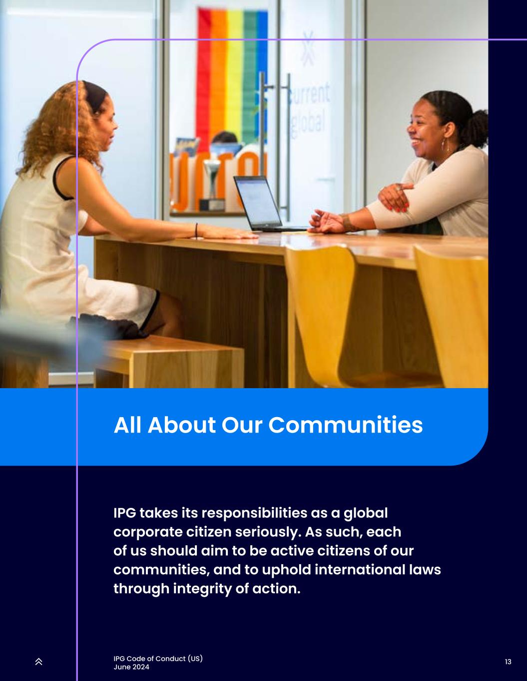 13IPG行为准则(美国)2024年6月All about our communities IPG认真履行作为全球企业公民的责任。因此,我们每个人都应该以成为我们社区的积极公民为目标,并通过行动的完整性来维护国际法。