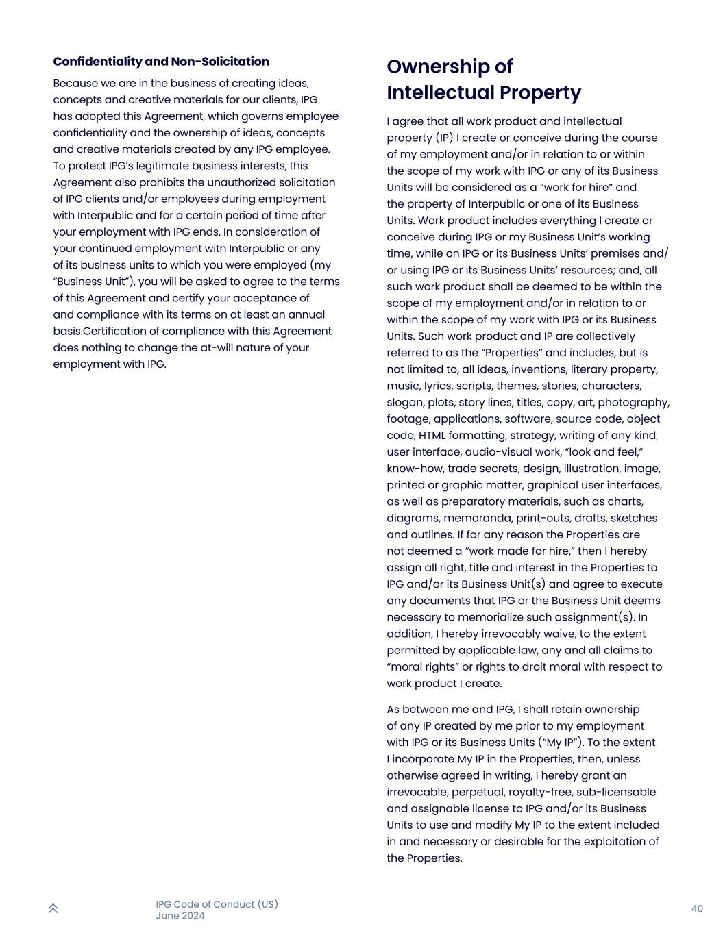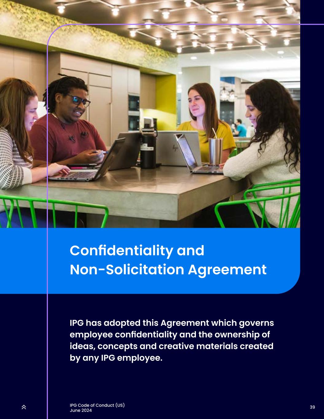 39IPG行为准则(美国)2024年6月保密和不招揽协议IPG已采纳本协议,该协议管辖员工的机密性以及任何IPG员工所创造的想法、概念和创意材料的所有权。