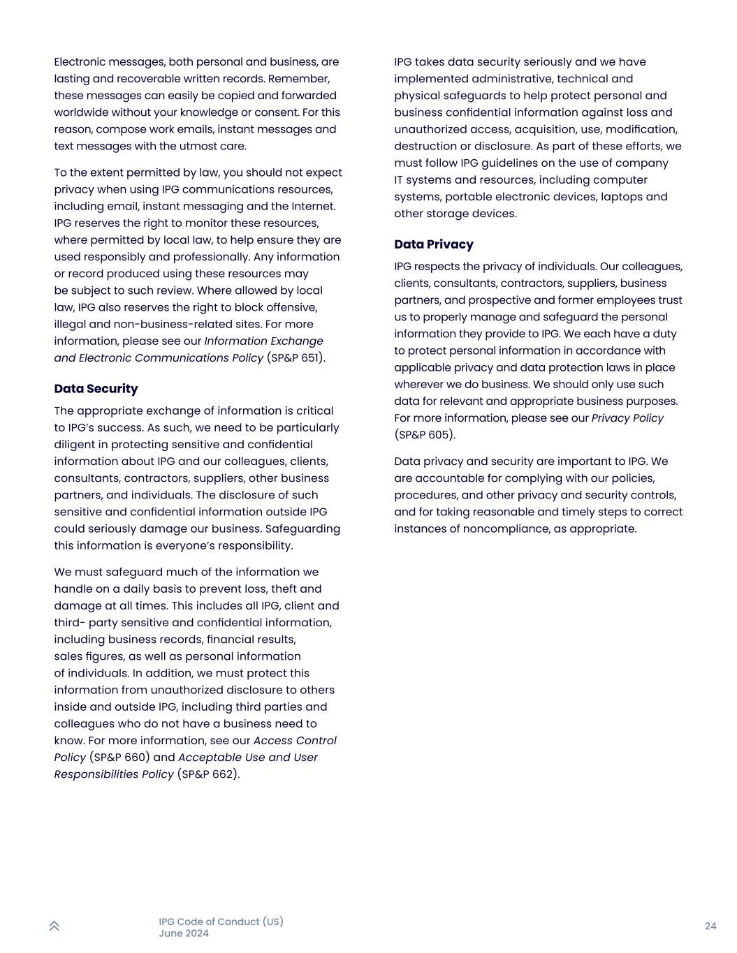 24IPG行为准则(美国)2024年6月个人和商业电子信息均为持久和可恢复的书面记录。请记住,这些消息很容易被复制并在全球范围内转发,而无需您的知情或同意。为此,要极其小心地撰写工作邮件、即时消息和短信。在法律允许的范围内,您在使用IPG通信资源时不应期望获得隐私,包括电子邮件、即时通讯和互联网。在当地法律允许的情况下,IPG保留对这些资源进行监控的权利,以帮助确保以负责任和专业的方式使用这些资源。使用这些资源制作的任何信息或记录都可能受到此类审查。在当地法律允许的情况下,IPG还保留对冒犯性、违法和与经营无关的场所进行封堵的权利。更多信息请看我们的信息交流与电子通信政策(SP & P 651)。数据安全信息的适当交换对于IPG的成功至关重要。因此,我们需要特别勤勉地保护有关IPG及其同事、客户、顾问、承包商、供应商、其他业务合作伙伴以及个人的敏感和机密信息。在IPG外部披露此类敏感和机密信息可能会严重损害我们的业务。维护好这些信息,每个人都有责任。我们要保护好日常处理的很多信息,时刻防止丢失、被盗和损坏。这包括所有IPG、客户和第三方的敏感和机密信息,包括商业记录、财务业绩、销售数据,以及个人的个人信息。另外,我们要保护好这些信息,不被擅自透露给IPG内外的其他人,包括没有业务需要的第三方和同事都知道。有关更多信息,请参阅我们的访问控制政策(SP & P 660)和可接受的使用和用户责任政策(SP & P 662)。IPG非常重视数据安全,我们实施了行政、技术和实物保护措施,以帮助保护个人和企业的机密信息,使其免受丢失和未经授权的访问、获取、使用、修改、销毁或泄露。作为这些努力的一部分,我们必须遵循IPG关于使用公司IT系统和资源的准则,包括计算机系统、便携式电子设备、笔记本电脑和其他存储设备。数据隐私IPG尊重个人隐私。我们的同事、客户、顾问、承包商、供应商、业务合作伙伴以及潜在和前员工都相信我们能够妥善管理和保护他们提供给IPG的个人信息。我们每个人都有责任按照适用的隐私和数据保护法律保护个人信息,无论我们在哪里开展业务。我们应该只将这些数据用于相关和适当的商业目的。欲了解更多信息,请参阅我们的隐私政策(SP & P 605)。数据隐私和安全对IPG至关重要。我们有责任遵守我们的政策、程序以及其他隐私和安全控制,并酌情采取合理和及时的措施纠正不遵守情况。
