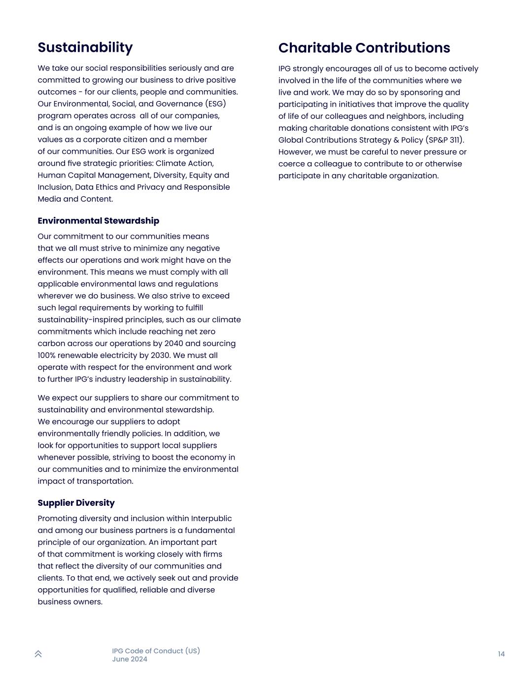 14IPG行为准则(美国)2024年6月可持续发展我们认真对待我们的社会责任,并致力于发展我们的业务,以推动积极成果——为我们的客户、人民和社区。我们的环境、社会和治理(ESG)计划在我们所有的公司中运作,是我们作为企业公民和社区成员如何践行我们价值观的一个持续例子。我们的ESG工作围绕五个战略优先事项进行组织:气候行动、人力资本管理、多样性、公平和包容、数据伦理和隐私以及负责任的媒体和内容。环境管理我们对社区的承诺意味着,我们所有人都必须努力将我们的运营和工作可能对环境产生的任何负面影响降到最低。这意味着,无论我们在哪里开展业务,我们都必须遵守所有适用的环境法律法规。我们还努力通过努力履行受可持续发展启发的原则来超越这些法律要求,例如我们的气候承诺,其中包括到2040年在我们的运营中实现净零碳排放,以及到2030年采购100%的可再生电力。我们都必须在运营时尊重环境,努力进一步提高IPG在可持续发展方面的行业领先地位。我们希望我们的供应商分享我们对可持续发展和环境管理的承诺。我们鼓励我们的供应商采取环保政策。此外,我们尽可能寻找机会支持当地供应商,努力促进我们社区的经济,并将运输对环境的影响降至最低。供应商多样性促进InterPublic内部和我们业务合作伙伴之间的多样性和包容性是我们组织的一项基本原则。这一承诺的一个重要部分是与反映我们社区和客户多样性的公司密切合作。为此,我们积极为合格、可靠和多样化的企业主寻找并提供机会。慈善捐助丨IPG强烈鼓励我们所有人都能积极投身到自己生活、工作所在社区的生活中去。为此,我们可以通过赞助和参与提高同事和邻居生活质量的倡议来实现,包括根据IPG的全球贡献战略与政策(SP & P 311)进行慈善捐赠。但是,一定要小心,千万不要给同事施压、胁迫,让他们为任何慈善组织捐款或者以其他方式参与。