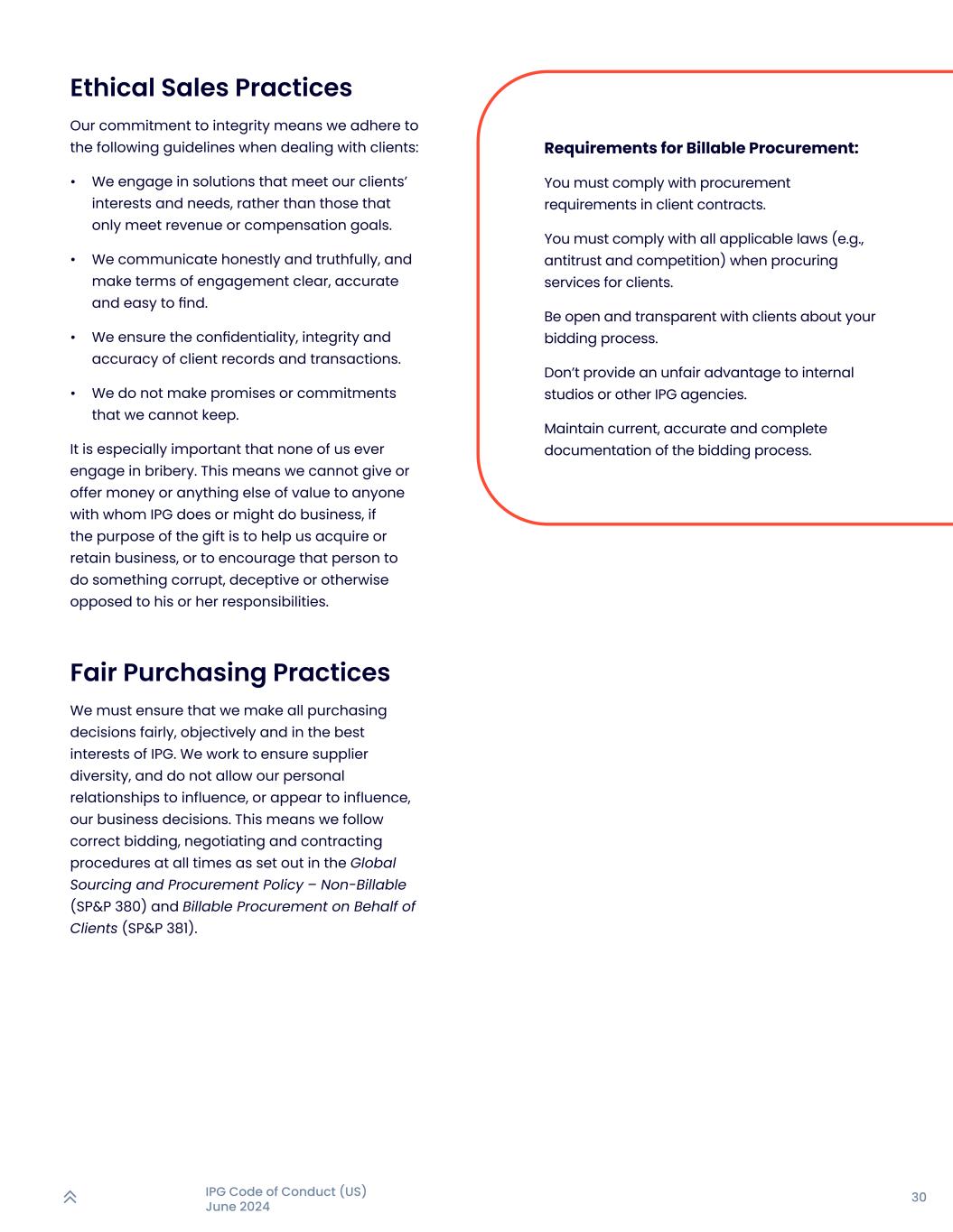 30IPG行为准则(美国)2024年6月道德销售实践我们对诚信的承诺意味着我们在与客户打交道时遵守以下准则:•我们采用满足客户利益和需求的解决方案,而不是仅满足收入或薪酬目标的解决方案。•我们以诚实和真实的方式进行沟通,并使接触条款清晰、准确和易于查找。•我们确保客户记录和交易的保密性、完整性和准确性。•我们不会做出我们无法遵守的承诺或承诺。尤其重要的是,我们谁也不要搞贿赂。这意味着我们不能向与IPG有业务往来或可能有业务往来的任何人赠送或提供金钱或任何其他有价值的东西,如果赠送的目的是帮助我们获得或保留业务,或鼓励该人做一些腐败、欺骗或以其他方式与其职责相悖的事情。公平采购做法我们必须确保我们以公平、客观和符合IPG最佳利益的方式做出所有采购决策。我们致力于确保供应商的多样性,不允许我们的个人关系影响,或似乎影响我们的商业决策。这意味着我们在任何时候都遵循全球采购和采购政策——不可计费(SP & P 380)和代表客户的可计费采购(SP & P 381)中规定的正确的招标、谈判和签约程序。可结算采购要求:您必须遵守客户合同中的采购要求。在为客户采购服务时,您必须遵守所有适用的法律(例如,反垄断和竞争)。就您的投标过程与客户保持公开透明。不得向内部工作室或其他IPG代销机构提供不正当优势。保持投标过程的最新、准确和完整的文件。
