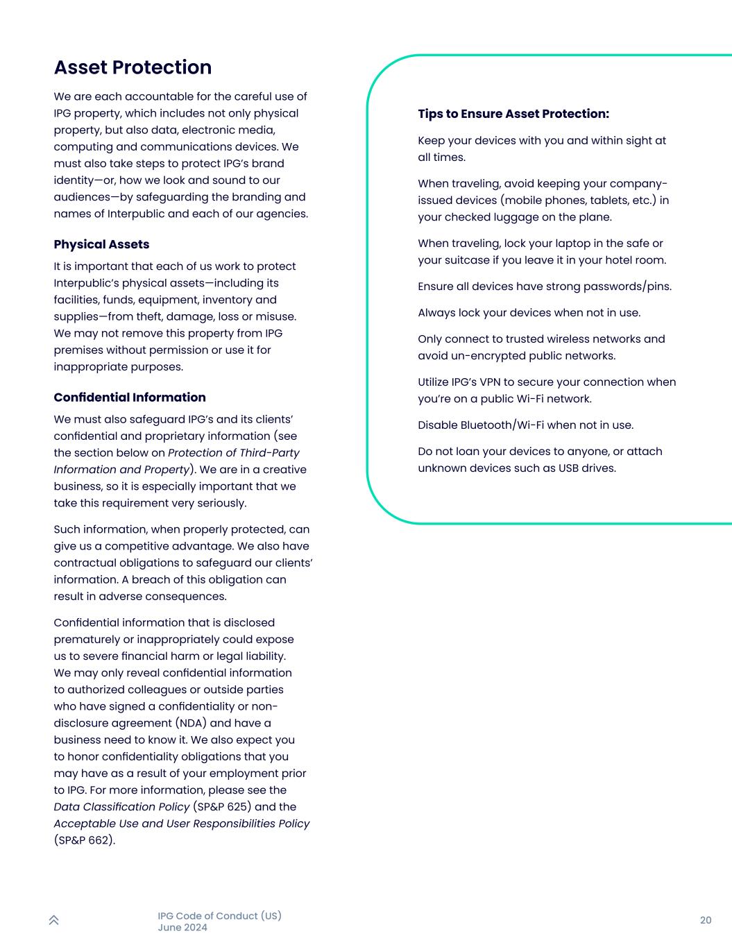 20IPG行为准则(美国)2024年6月确保资产保护的提示:让您的设备随身携带,时刻在视线范围内。出行时,避免将公司发放的设备(手机、平板电脑等)放在飞机托运行李中。旅行时,如果将笔记本电脑留在酒店房间,请将其锁在保险箱或行李箱中。确保所有设备都有强密码/引脚。在不使用设备时,请务必锁定设备。仅连接受信任的无线网络,避免未加密的公共网络。当您使用公共Wi-Fi网络时,使用IPG的VPN保护您的连接安全。不使用时禁用蓝牙/Wi-Fi。不要将设备借给任何人,或附加USB驱动器等未知设备。资产保护我们每个人都对慎用IPG财产负责,这不仅包括实物财产,还包括数据、电子媒体、计算和通信设备等。我们还必须采取措施,通过保护InterPublic和我们每个代理机构的品牌和名称,来保护IPG的品牌标识——或者说,我们在受众面前的样子和声音——。实物资产重要的是,我们每个人都要努力保护InterPublic的实物资产——包括其设施、资金、设备、库存和用品——免遭盗窃、损坏、丢失或滥用。未经许可,我们不得将这处房产移出IPG处所或用于不适当的目的。机密信息我们也要保护好IPG及其客户的机密和专有信息(见下文第三方信息和财产保护部分)。我们是做创意生意的,所以特别重要的是,我们要非常认真地对待这一要求。这些信息,如果得到适当保护,可以给我们带来竞争优势。我们也有保护客户信息的合同义务。违反这一义务可能会导致不良后果。过早或不适当披露的机密信息可能会使我们面临严重的财务损害或法律责任。我们可能只会向已签署保密或保密协议(NDA)并有业务需求的授权同事或外部人士透露机密信息。我们还希望您履行因您在IPG之前受雇而可能承担的保密义务。更多信息请见数据分类政策(SP & P 625)和可接受的使用和用户责任政策(SP & P 662)。
