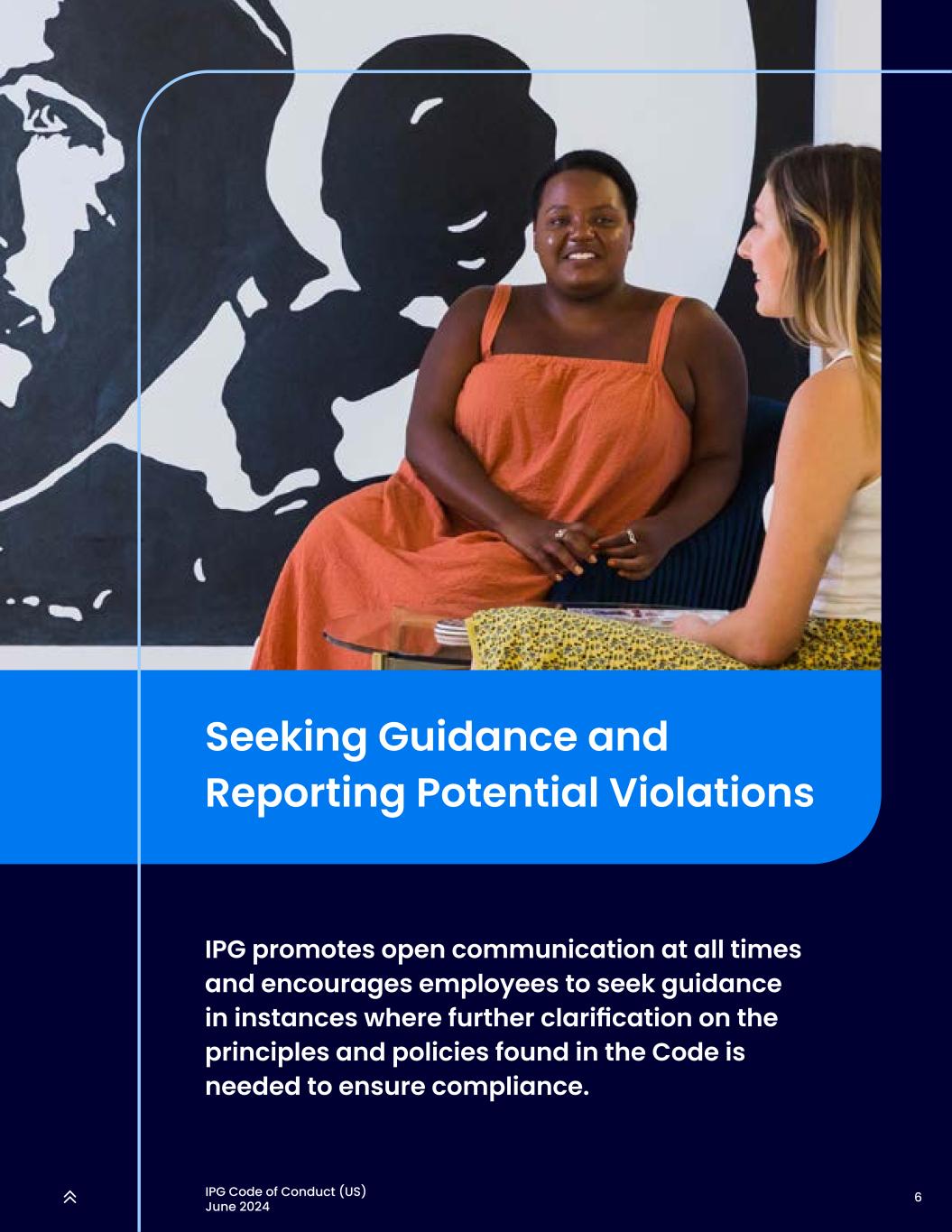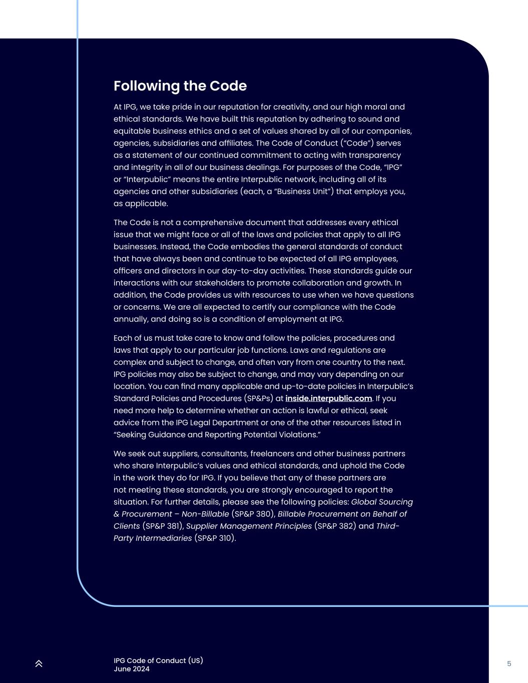 5IPG行为准则(美国)2024年6月遵循IPG的准则,我们为自己在创造力方面的声誉以及我们较高的道德和伦理标准感到自豪。我们通过坚持健全和公平的商业道德以及我们所有公司、机构、子公司和关联公司共享的一套价值观,建立了这一声誉。行为准则(“准则”)是我们继续致力于在所有业务交易中以透明和诚信行事的声明。就本守则而言,“IPG”或“InterPublic”是指整个InterPublic网络,包括其所有代理机构和雇用您的其他子公司(每一个“业务单位”)(如适用)。该准则不是一份全面的文件,它涉及我们可能面临的每一个道德问题或适用于所有IPG业务的所有法律和政策。相反,该准则体现了在我们的日常活动中,所有IPG员工、管理人员和董事一直并将继续期望遵守的一般行为标准。这些标准指导我们与利益相关者的互动,以促进协作和增长。此外,该准则为我们提供了资源,供我们在有问题或疑虑时使用。我们都被期望每年证明我们符合准则,而这样做是受雇于IPG的条件。我们每个人都要注意了解和遵守适用于我们特定工作职能的政策、程序和法律。法律法规复杂,随时可能发生变化,而且往往因国家而异。IPG的政策也可能会发生变化,并可能因我们所在的地区而异。您可以在inside.interpublic.com上的Interpublic标准政策和程序(SP & P)中找到许多适用的最新政策。如果您需要更多帮助来确定某个行为是否合法或符合道德,请向IPG法律部门或“寻求指导并报告潜在违规行为”中列出的其他资源之一寻求建议。我们寻找与InterPublic有共同价值观和道德标准的供应商、顾问、自由职业者和其他商业伙伴,并在他们为IPG所做的工作中坚持准则。如果你认为这些合作伙伴中的任何一个没有达到这些标准,我们强烈鼓励你报告情况。欲了解更多详情,请参阅以下政策:全球采购和采购–不可计费(SP & P 380)、代表客户的可计费采购(SP & P 381)、供应商管理原则(SP & P 382)和第三方中介(SP & P 310)。