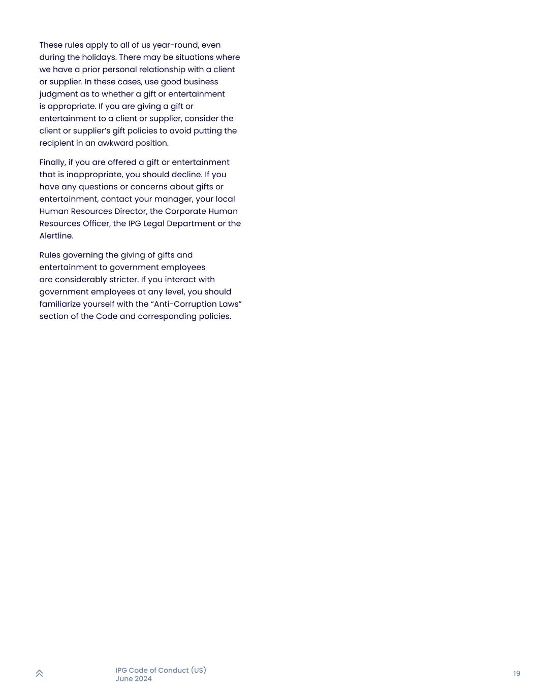 19IPG行为准则(美国)2024年6月这些规则全年适用于我们所有人,即使在假期也是如此。可能存在我们与客户或供应商有事先私人关系的情况。在这些情况下,用良好的商业判断来判断礼物或娱乐是否合适。如果您正在向客户或供应商赠送礼物或娱乐,请考虑客户或供应商的礼物政策,以避免使接收者处于尴尬的境地。最后,如果有人给你送了不合适的礼物或娱乐,你应该谢绝。如果您对礼品或娱乐有任何疑问或疑虑,请与您的经理、当地的人力资源总监、公司人力资源官、IPG法务部或Alertline联系。关于给政府雇员送礼和招待的规定要严格得多。如果你和任何级别的政府工作人员互动,你应该熟悉守则中的“反腐败法”部分和相应的政策。