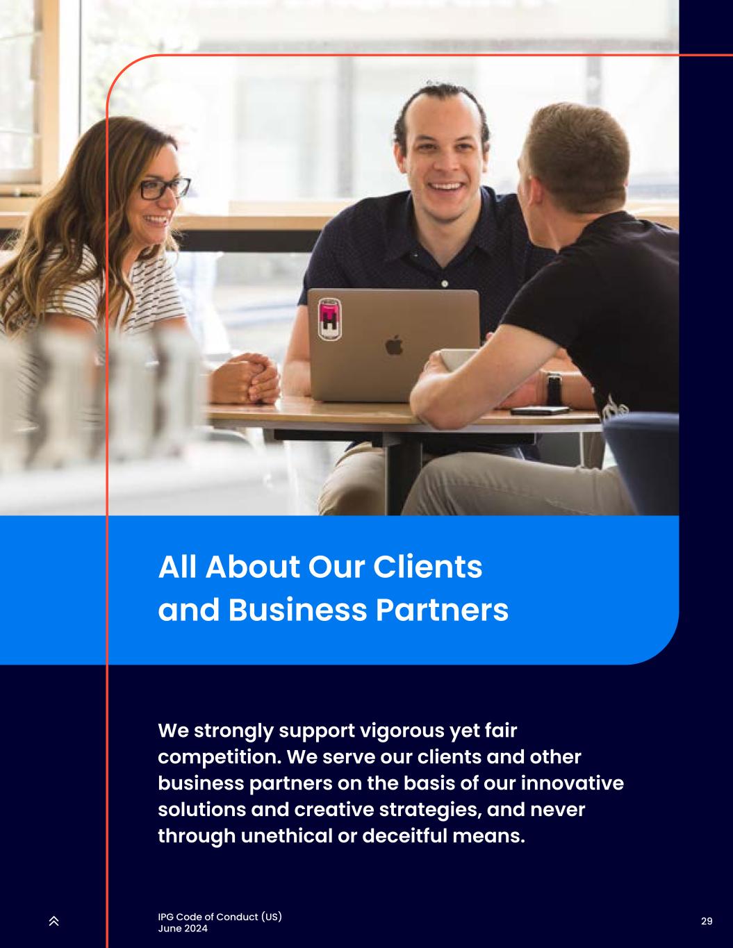 29IPG行为准则(美国)2024年6月All about our clients and business partners We strongly support vigorous but fair competition。我们根据我们的创新解决方案和创造性战略为客户和其他业务合作伙伴提供服务,绝不通过不道德或欺骗的方式。