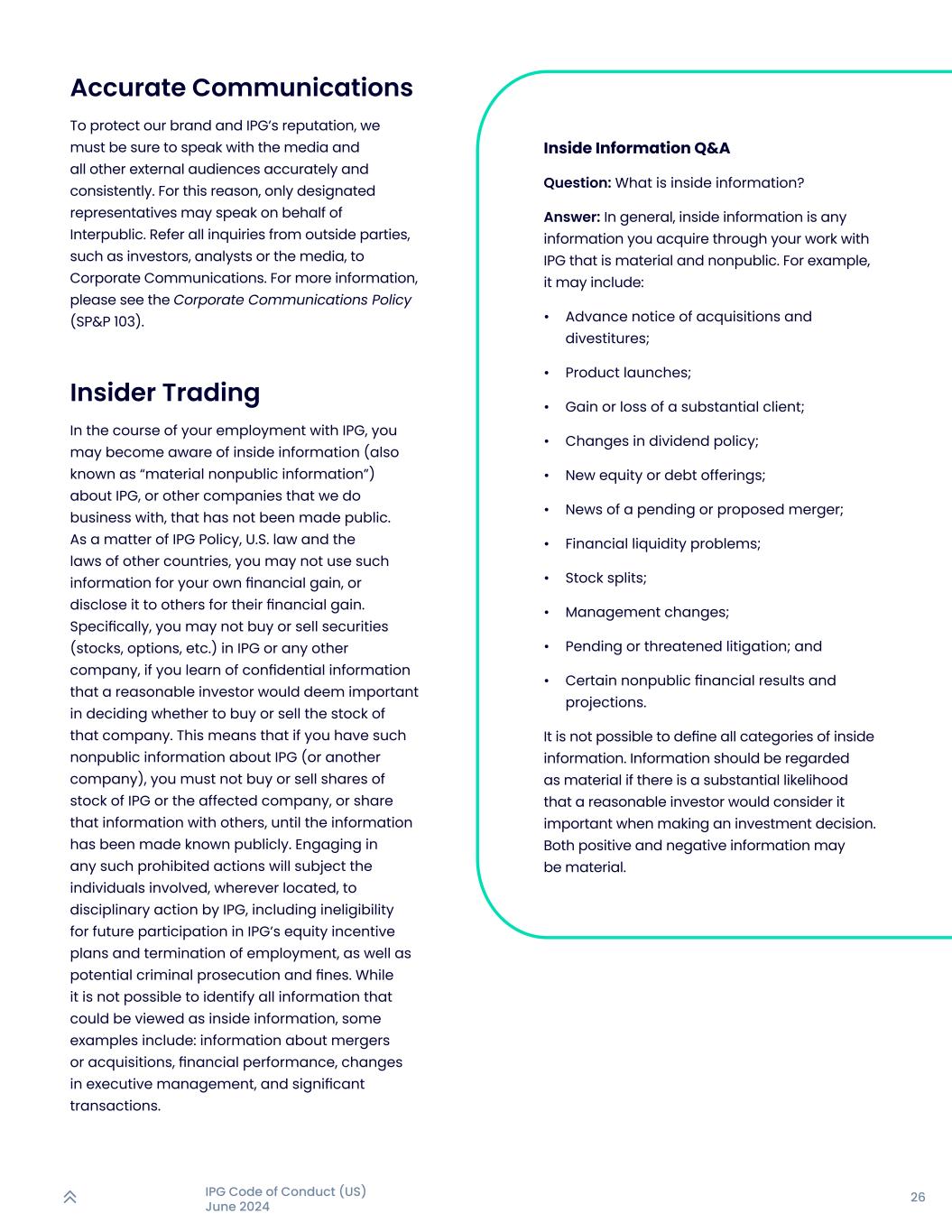 26IPG行为准则(美国)2024年6月精准传播为保护我们的品牌和IPG的声誉,我们必须确保与媒体和所有其他外部受众准确、一致地交谈。为此,只有指定的代表才能代表InterPublic发言。将投资者、分析师或媒体等外部各方的所有问询,转介至企业传讯。欲了解更多信息,请参阅企业传播政策(SP & P 103)。在您受雇于IPG的过程中进行内幕交易,您可能会知悉有关IPG或与我们有业务往来的其他公司的内幕信息(也称为“重大非公开信息”),这些信息尚未公开。作为IPG政策、美国法律和其他国家法律的规定,您不得利用此类信息谋取自己的经济利益,或为他人谋取经济利益而将其泄露给他人。具体来说,如果您了解到合理的投资者认为在决定是否买卖该公司股票时具有重要意义的机密信息,则不得买卖IPG或任何其他公司的证券(股票、期权等)。这意味着,如果您有关于IPG(或其他公司)的此类非公开信息,在该信息公开前,不得买卖IPG或受影响公司的股票,或与他人分享该信息。从事任何此类禁止行为,将使所涉及的个人,无论位于何处,都将受到IPG的纪律处分,包括未来无法参与IPG的股权激励计划和终止雇佣,以及潜在的刑事起诉和罚款。虽然不可能识别所有可能被视为内幕信息的信息,但一些例子包括:有关合并或收购、财务业绩、高管变动和重大交易的信息。内幕消息问答提问:什么是内幕消息?答:一般而言,内幕信息是指您通过与IPG合作获得的任何重大、非公开的信息。例如,它可能包括:•收购和资产剥离的提前通知;•产品发布;•一个重要客户的收益或损失;•股息政策的变化;•新的股权或债务发行;•未决或拟议合并的消息;•财务流动性问题;•股票分割;•管理层变动;•未决或威胁诉讼;以及•某些非公开财务结果和预测。并不能对内幕信息的所有类别进行界定。如果合理的投资者在做出投资决定时很有可能认为信息很重要,则应将信息视为重要信息。正面和负面的信息都可能是重要的。